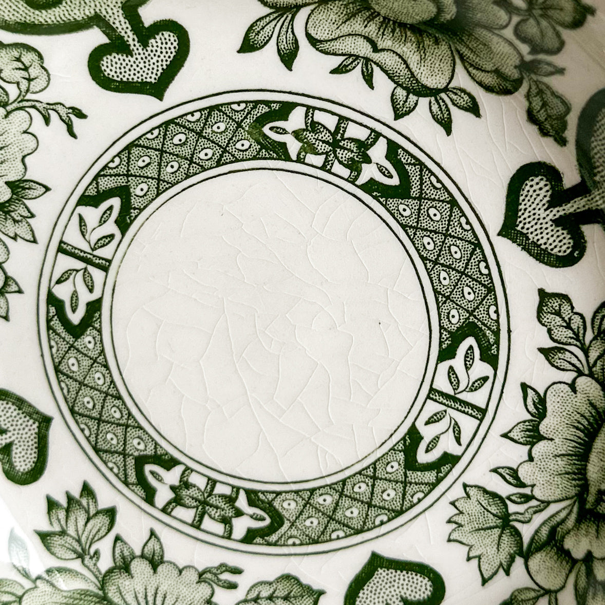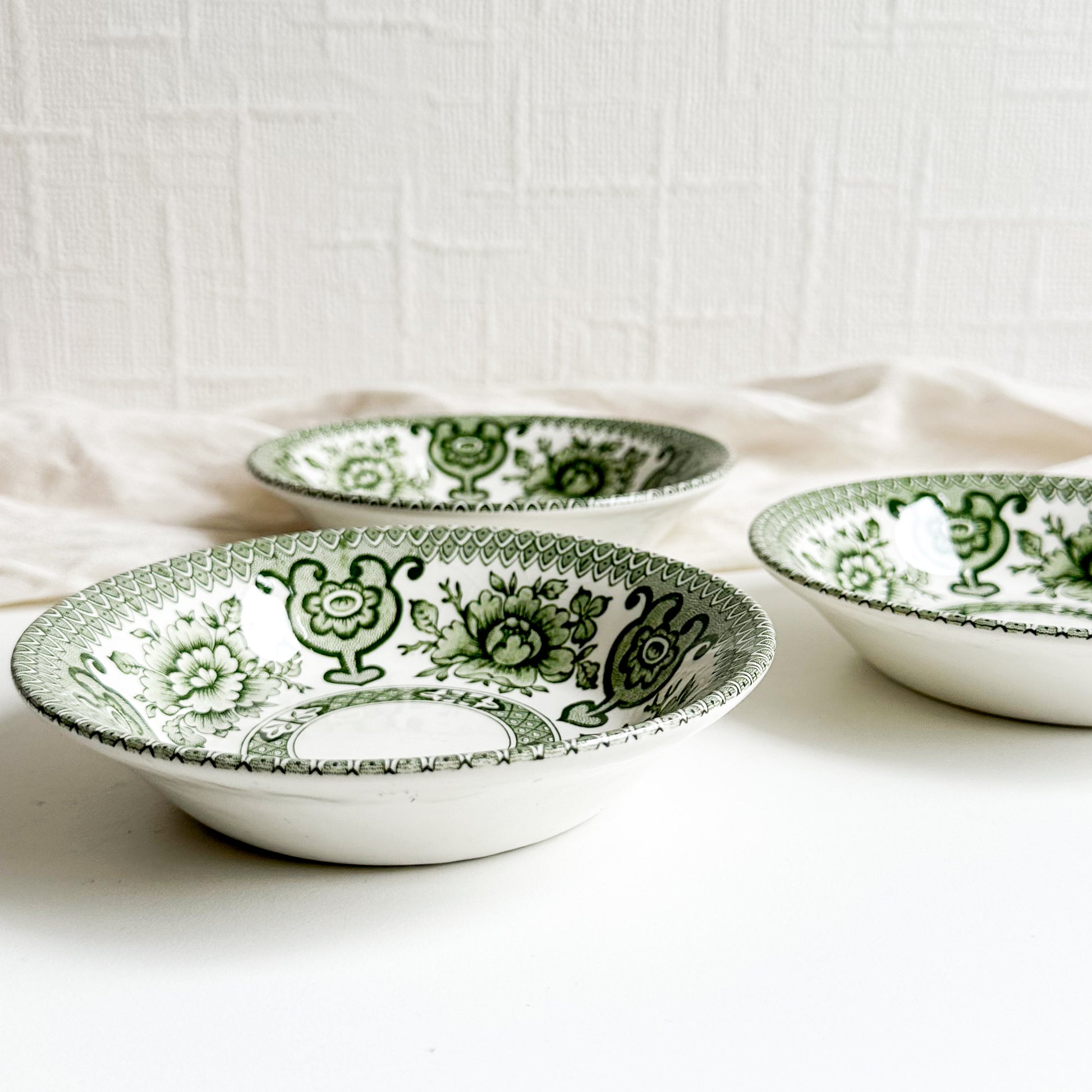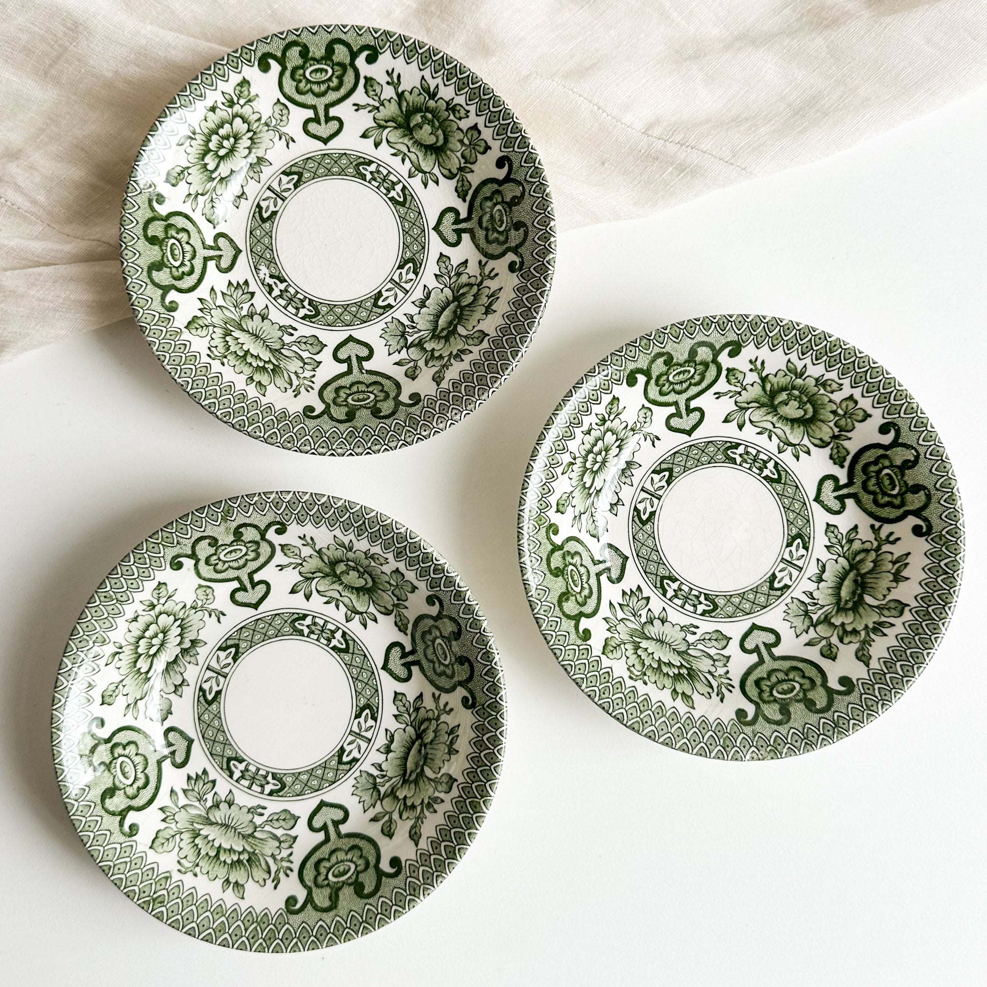 A set of 3 vintage plates made by English Ironstone Tableware, with a beautiful green and white pattern called Indian Tree.