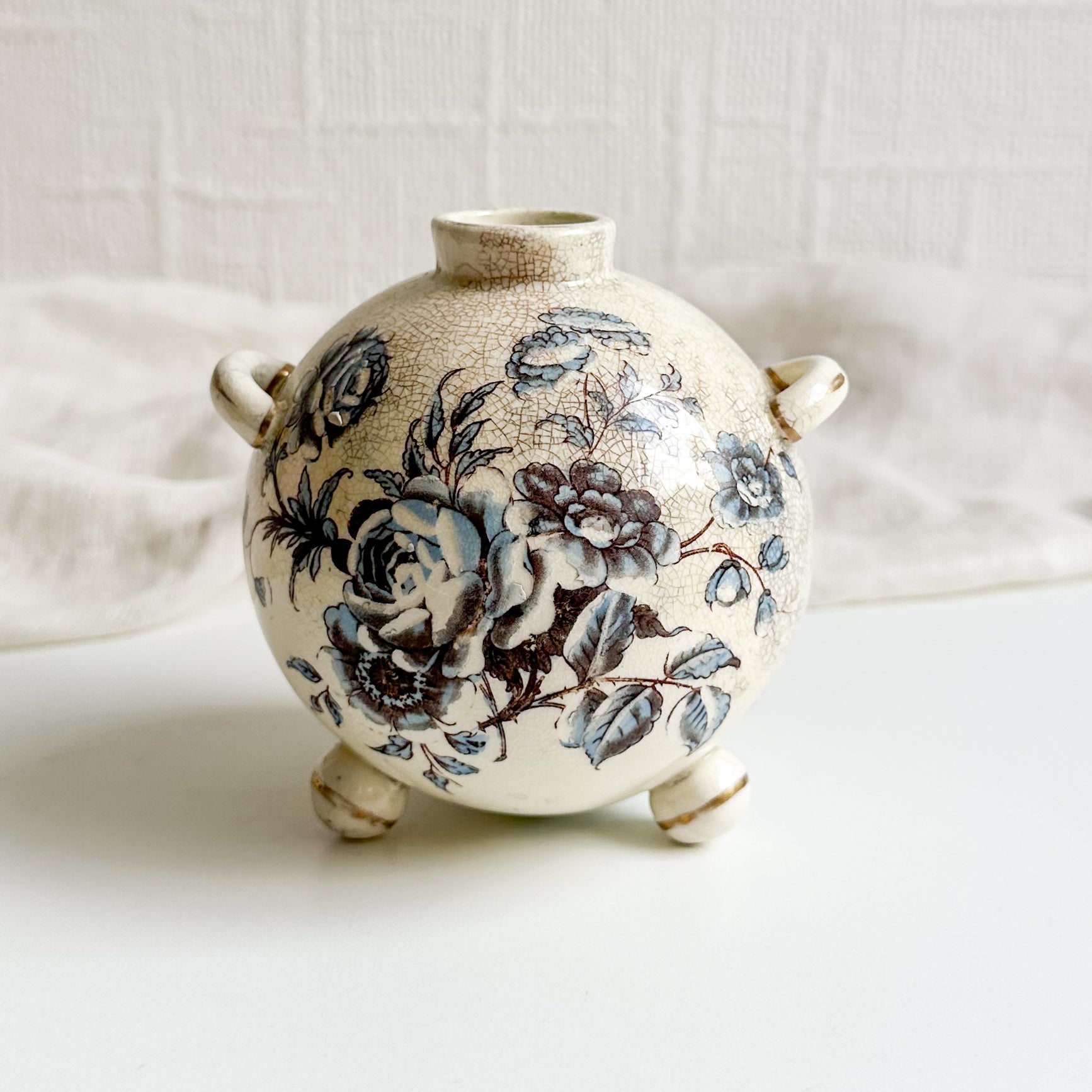 A very charming antique bud vase with narrow opening, two small handles and three cute little feet. Beautiful floral pattern in blue with a lot of wear and patina. Made in England in the 1880s by Bishop and Stonier.