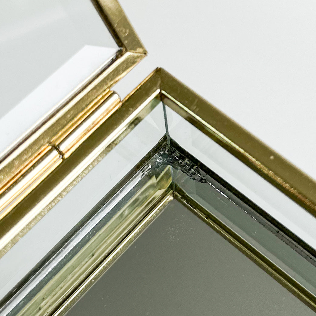 A gorgeous jewellery box made of bevelled greenish glass and brass, with mirror at the bottom. There is a flower / plant on the lid.
