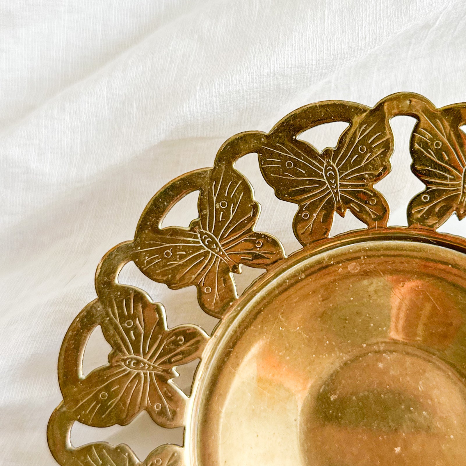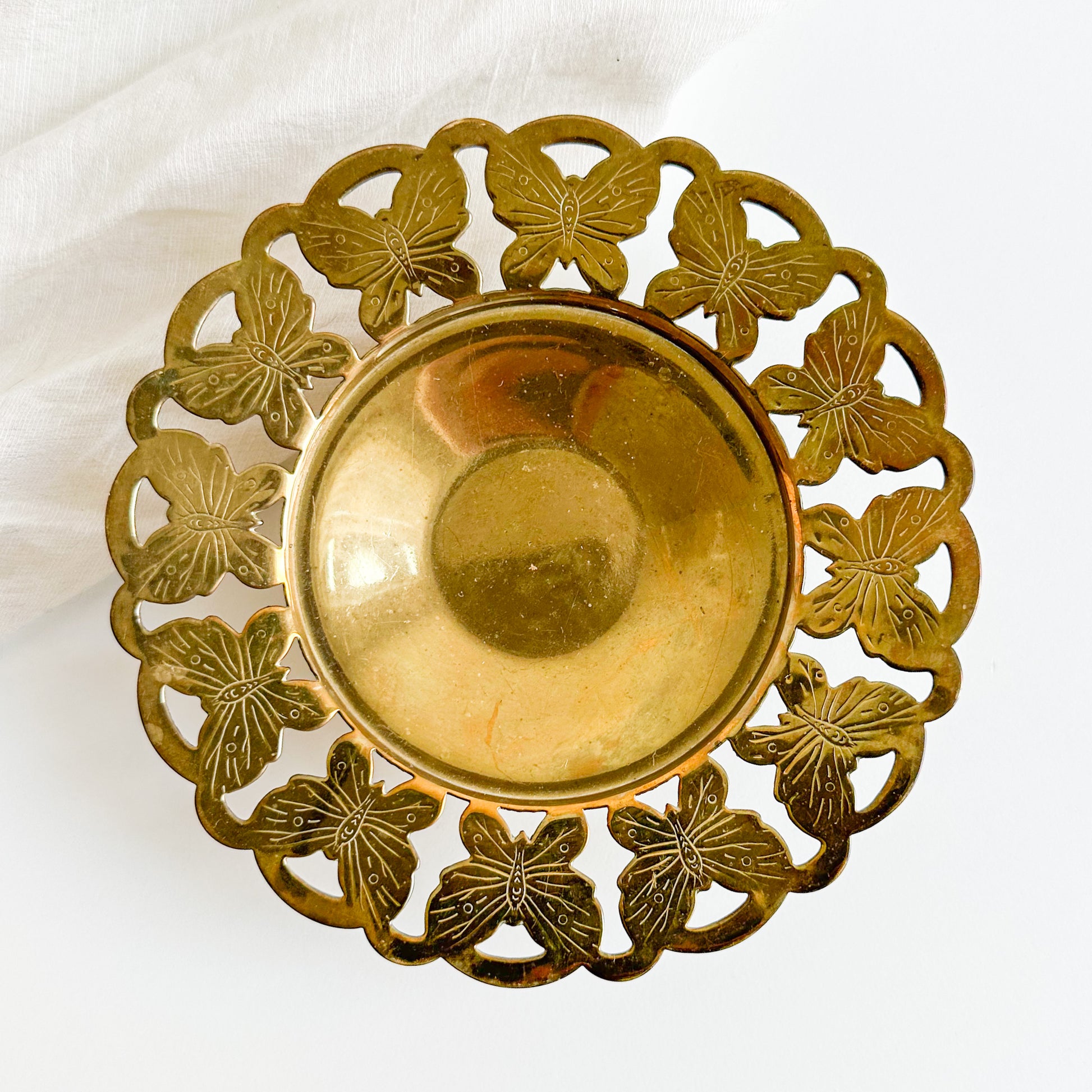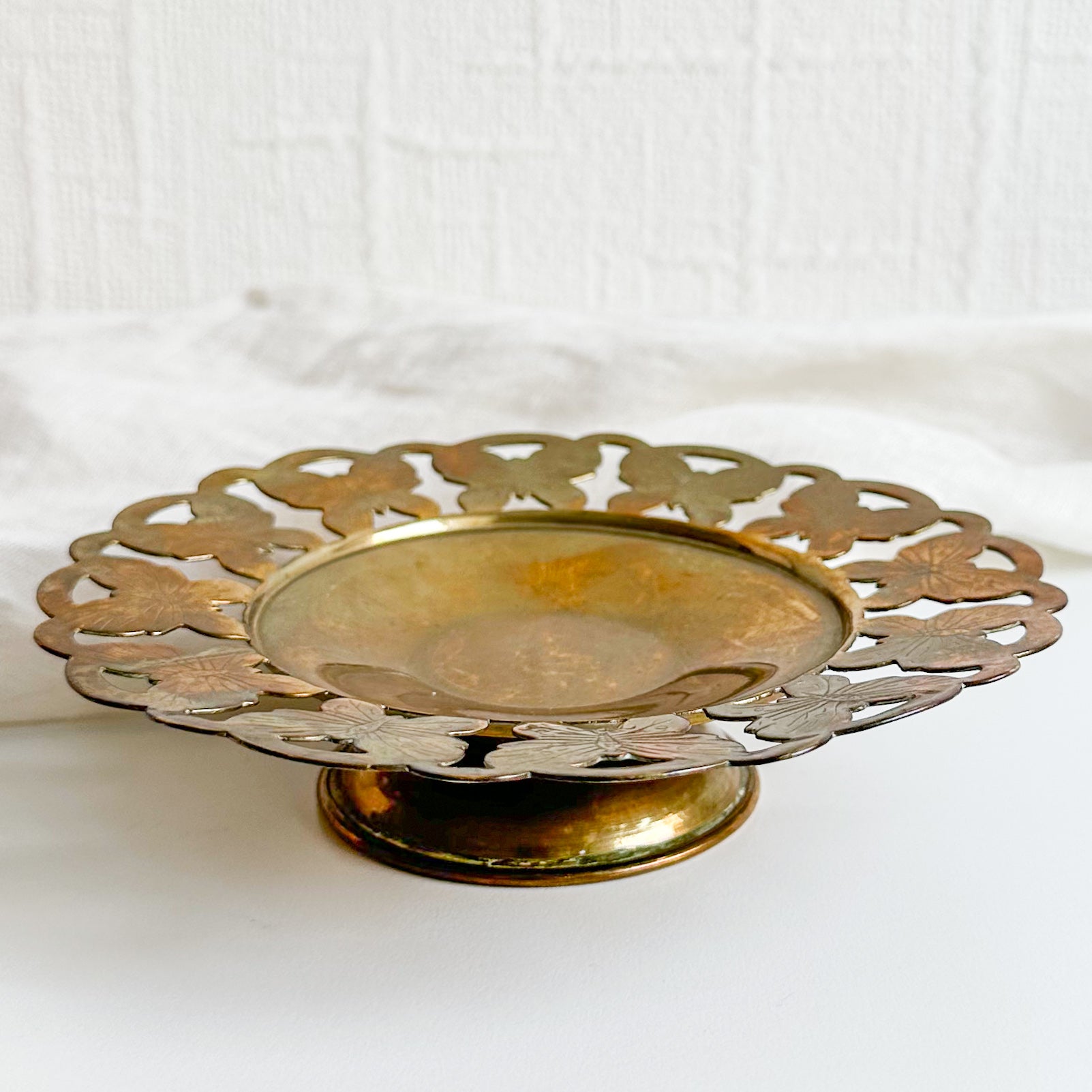 Beautiful pedestal brass dish with butterfly design on the border. Would make a lovely jewellery dish.