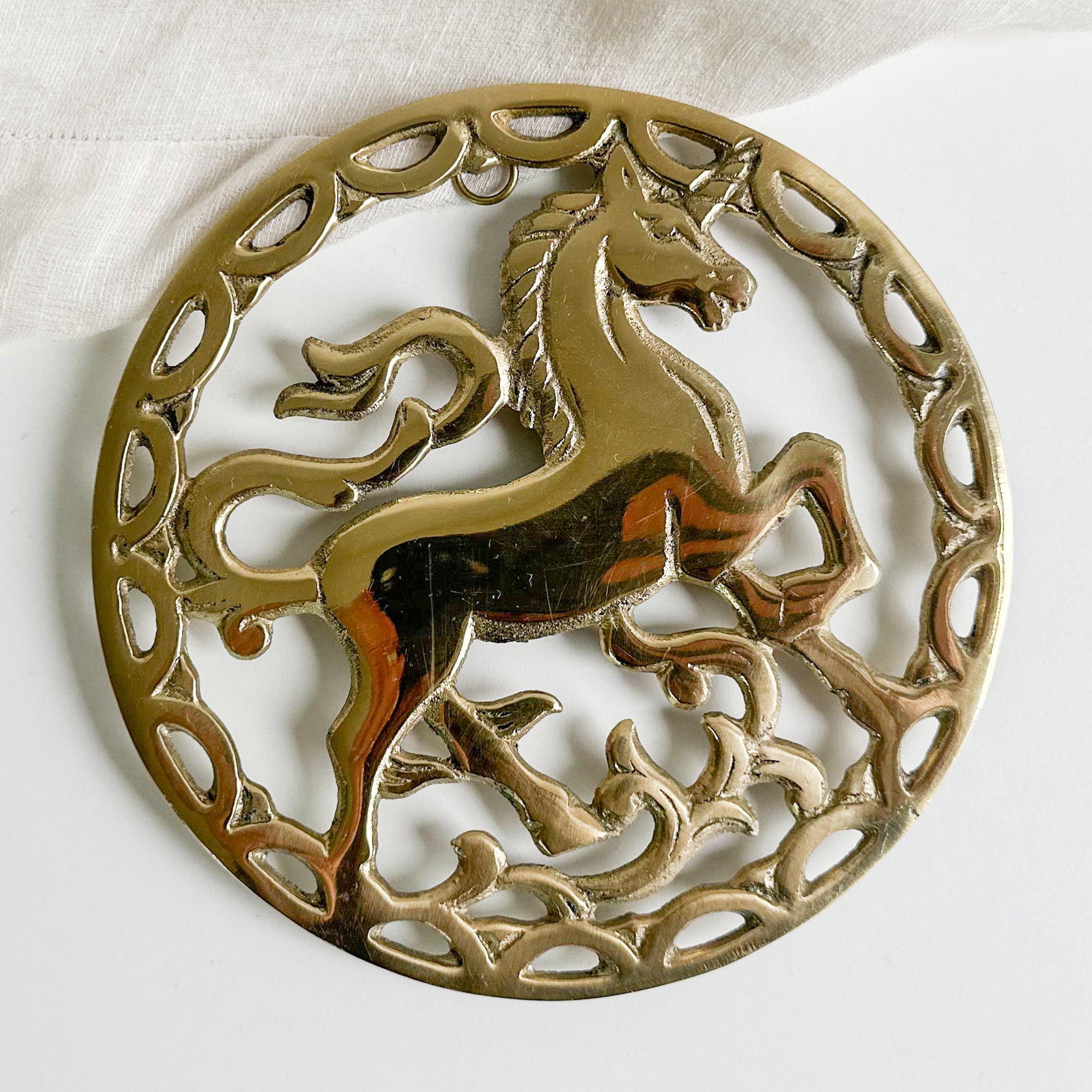 A vintage brass trivet with unicorn design. Perfect to hold hot pots or even as a wall decoration. It has a hook in the back.
