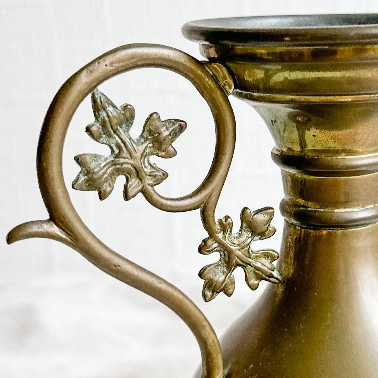 Gorgeous brass pedestal vase with intricate leaf design at the handles. There is a matching vase available in my shop.