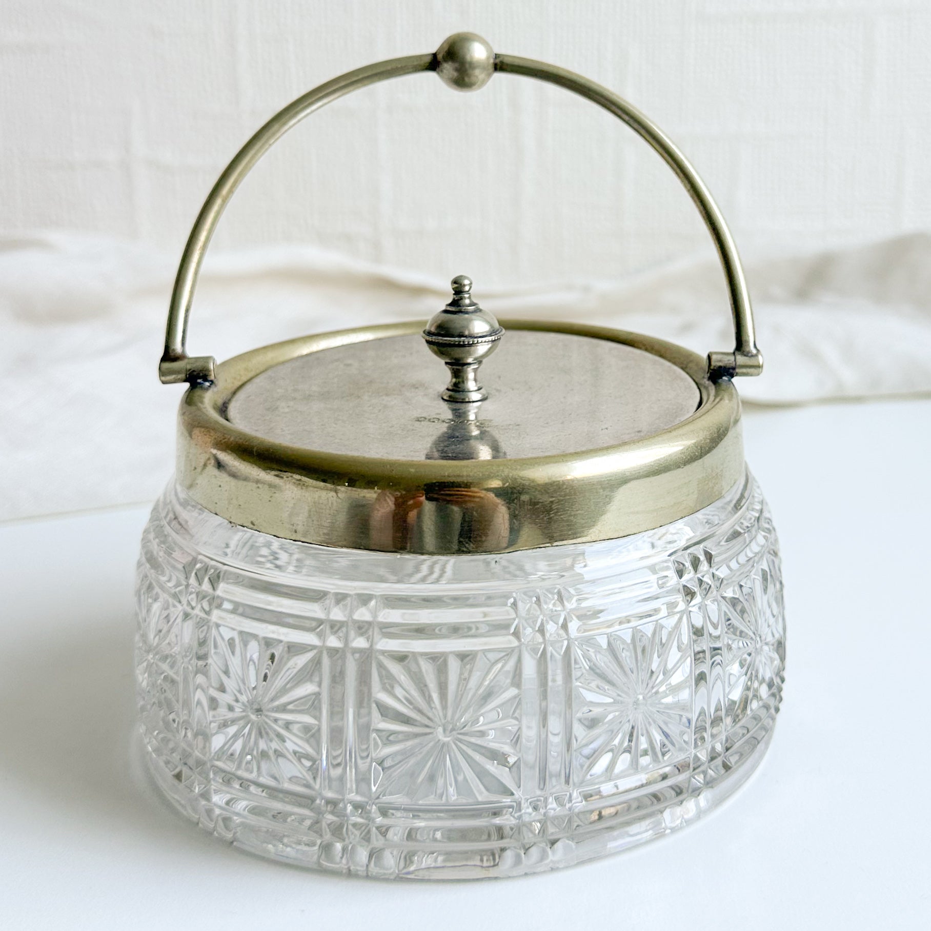 A lovely cut glass / crystal jar with silver plated lid and handle, likely from the early 1900s. There’s a hallmark on the lid and a registration number on the base of the jar.
