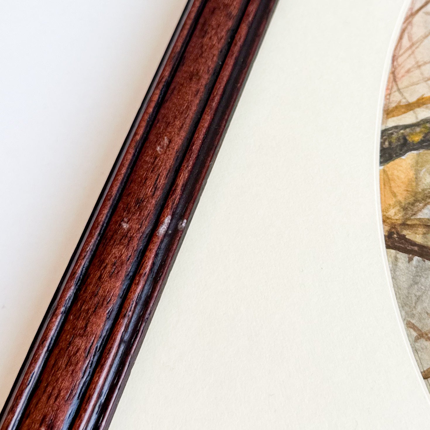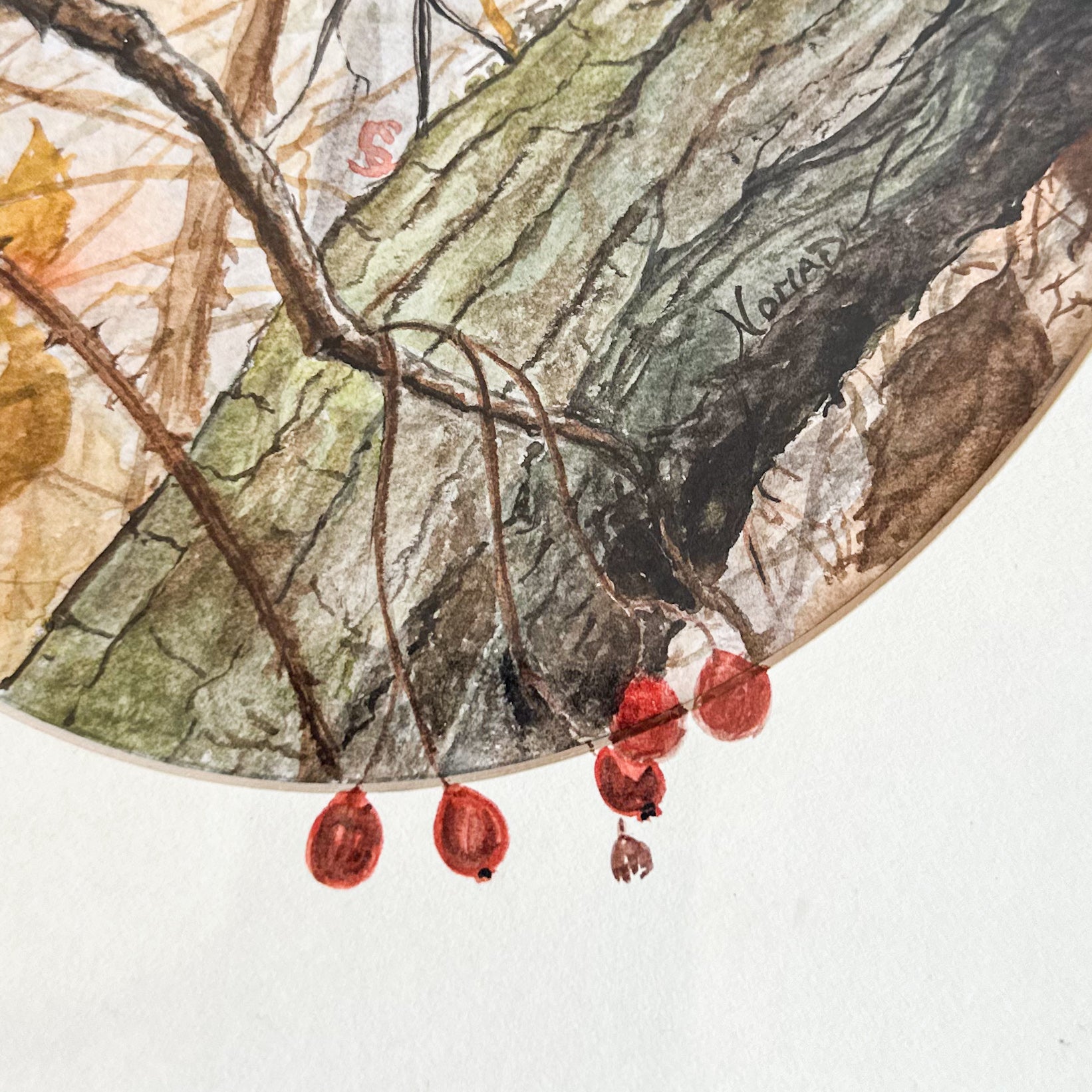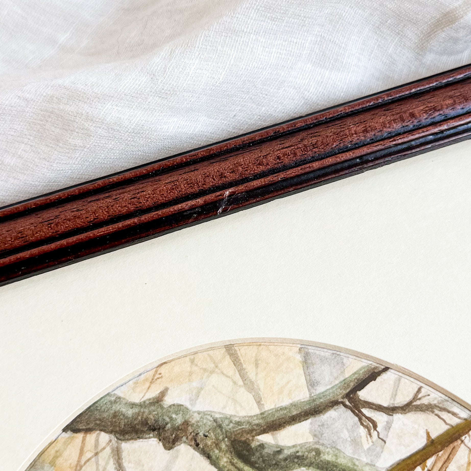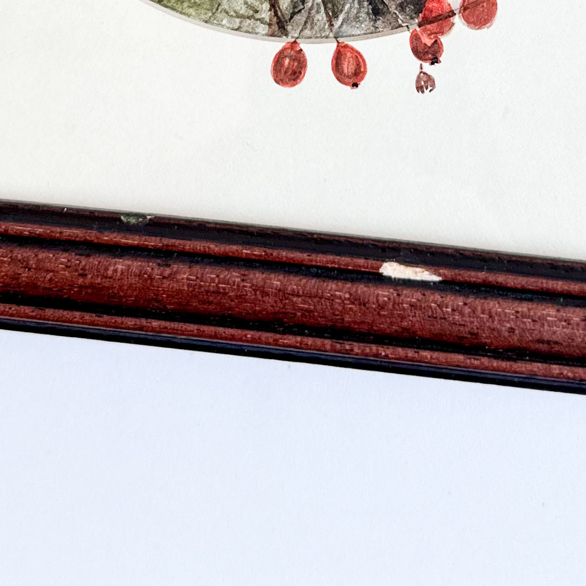 A beautiful original watercolour painting featuring a blue tit and rose hips or hawthorn berries, competed with wooden frame and oval matting.