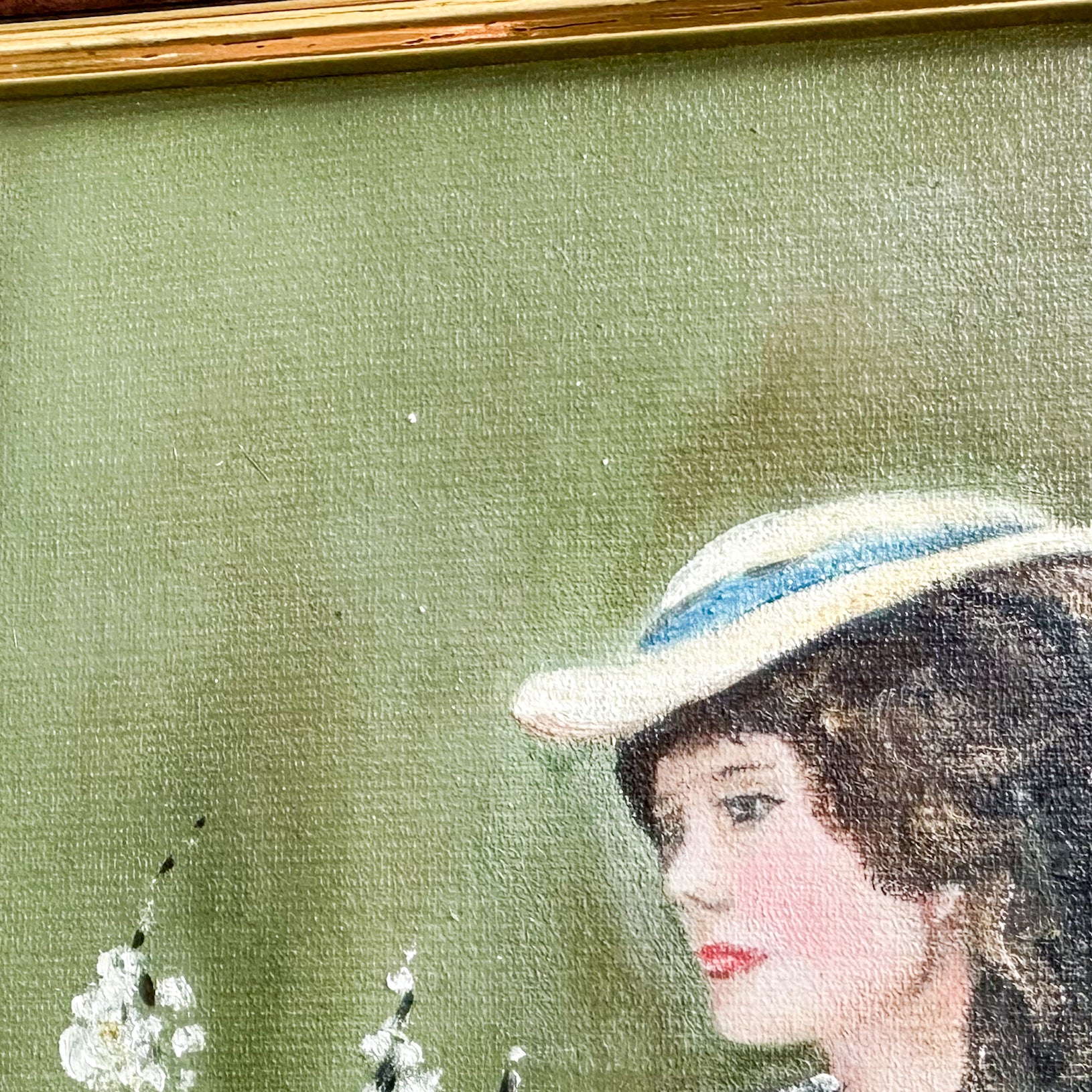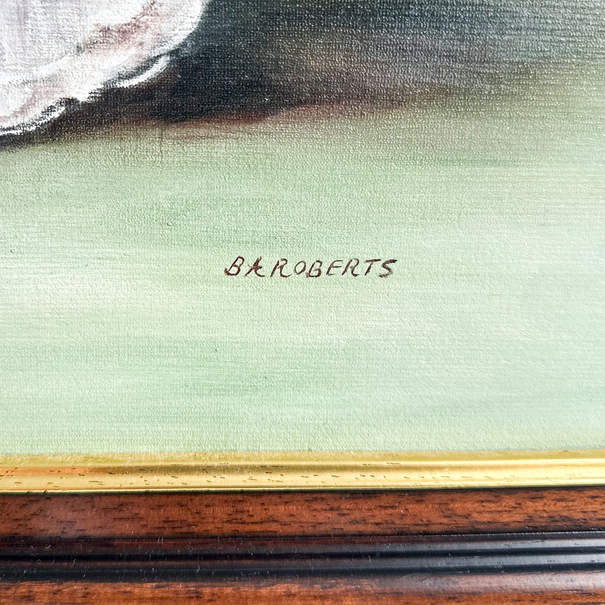 A lovely painting, featuring a lady in white holding a bunch of tree blossoms. This is a beautiful reproduction of the painting called ‘Spring’ by Sir John Lavery. Oil on board with wooden frame. Signed B A Roberts.