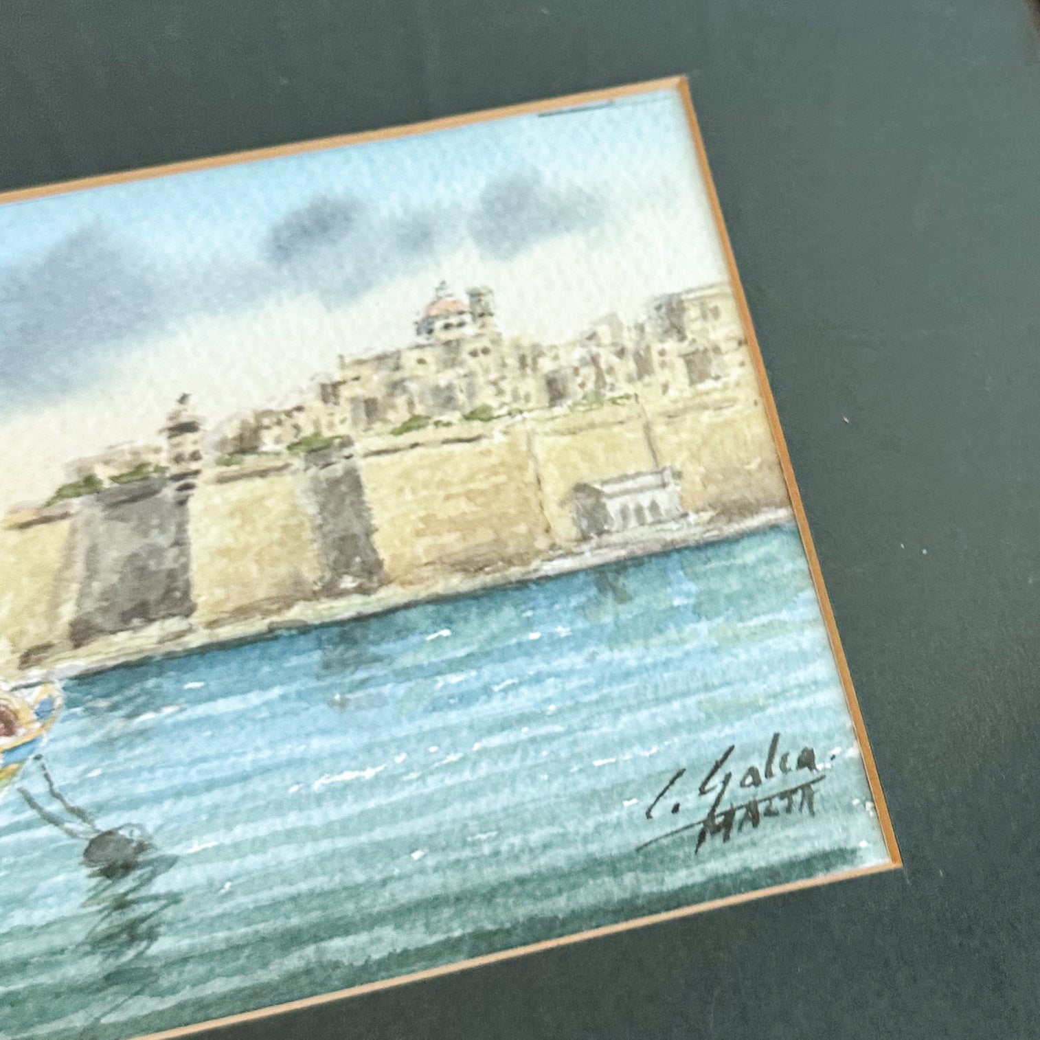 A beautiful original watercolour painting featuring a boat on the see with beautiful old buildings in the distance, completed with wooden frame and dark green matting.