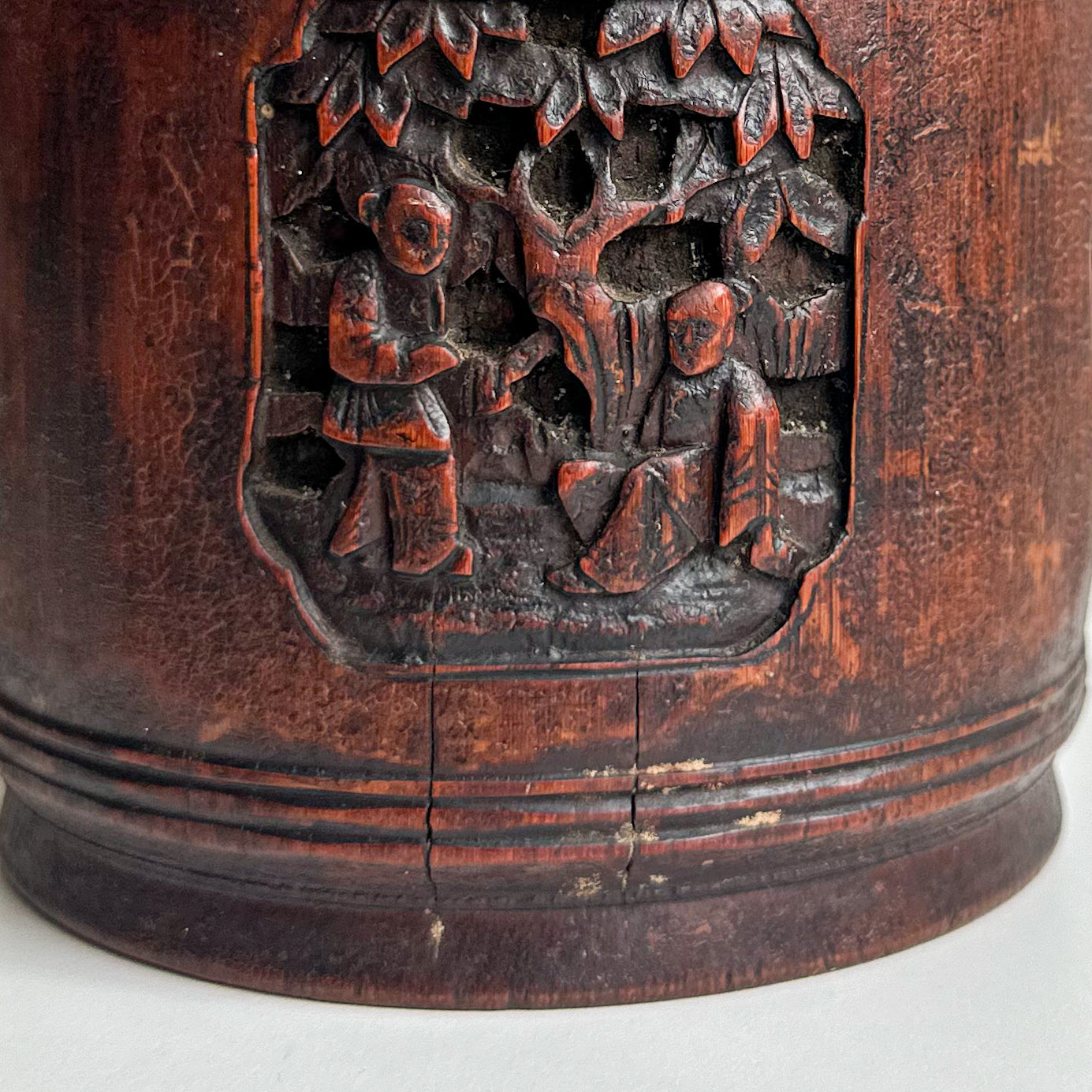 An antique Chinese carved bamboo tobacco box, likely from the late 19th century. Made from a section of a large bamboo trunk. The sides feature carved panels depicting figures and cranes. It has a rich, dark patina, consistent with its age and use.