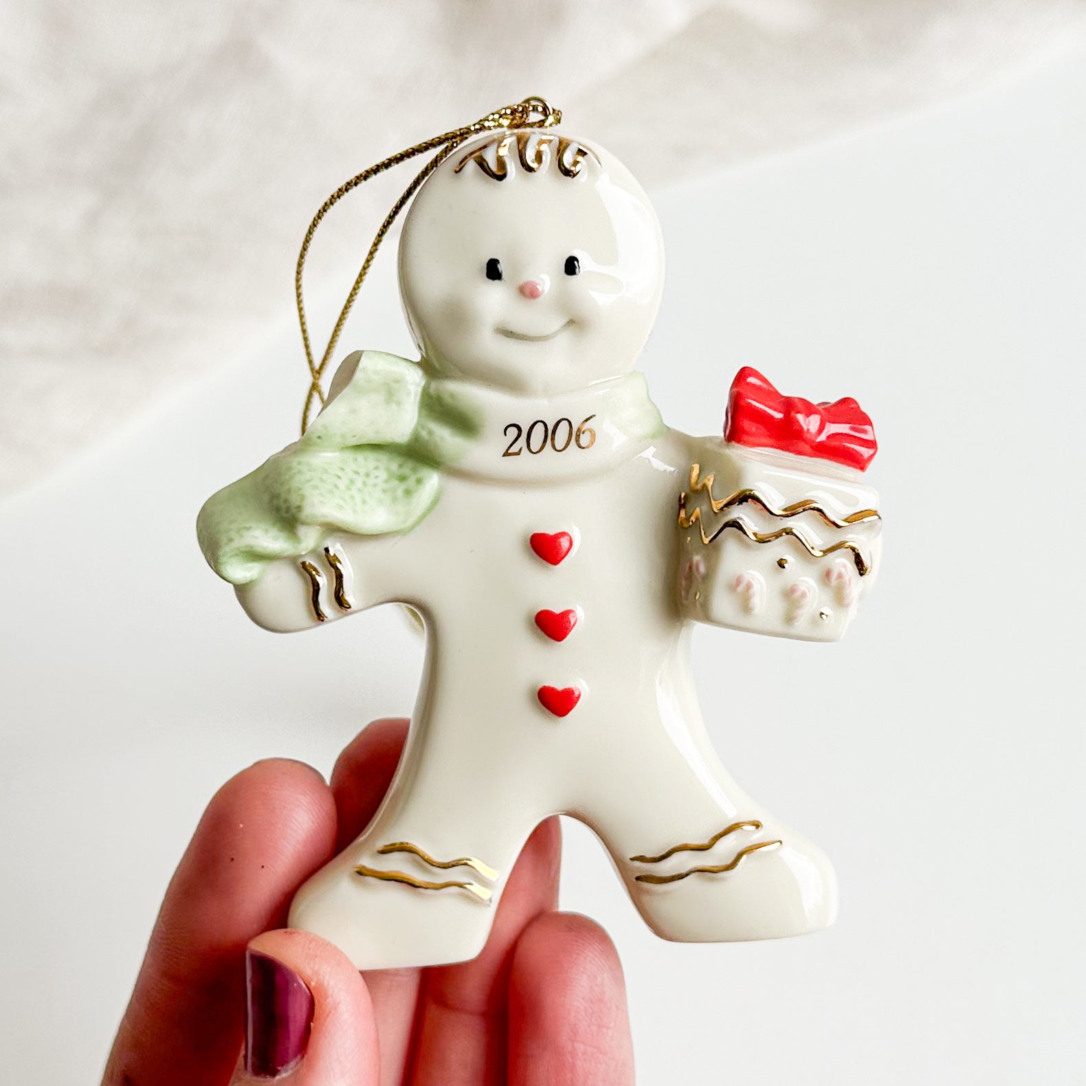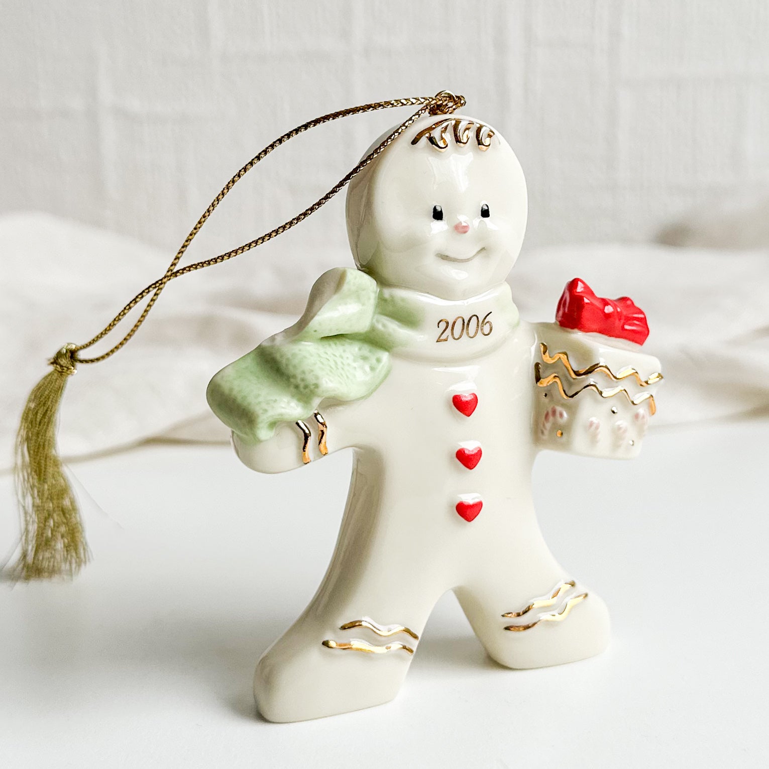 An adorable porcelain Christmas ornament featuring a gingerbread man holding a present. It had a golden string with tassel at the top. Made by Lenox in 2006.