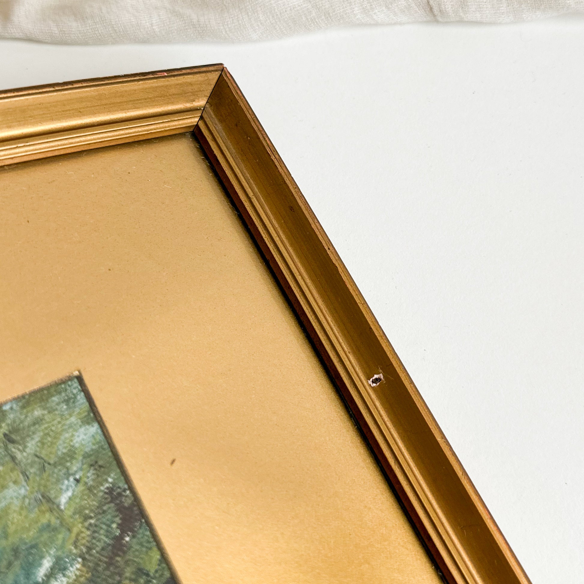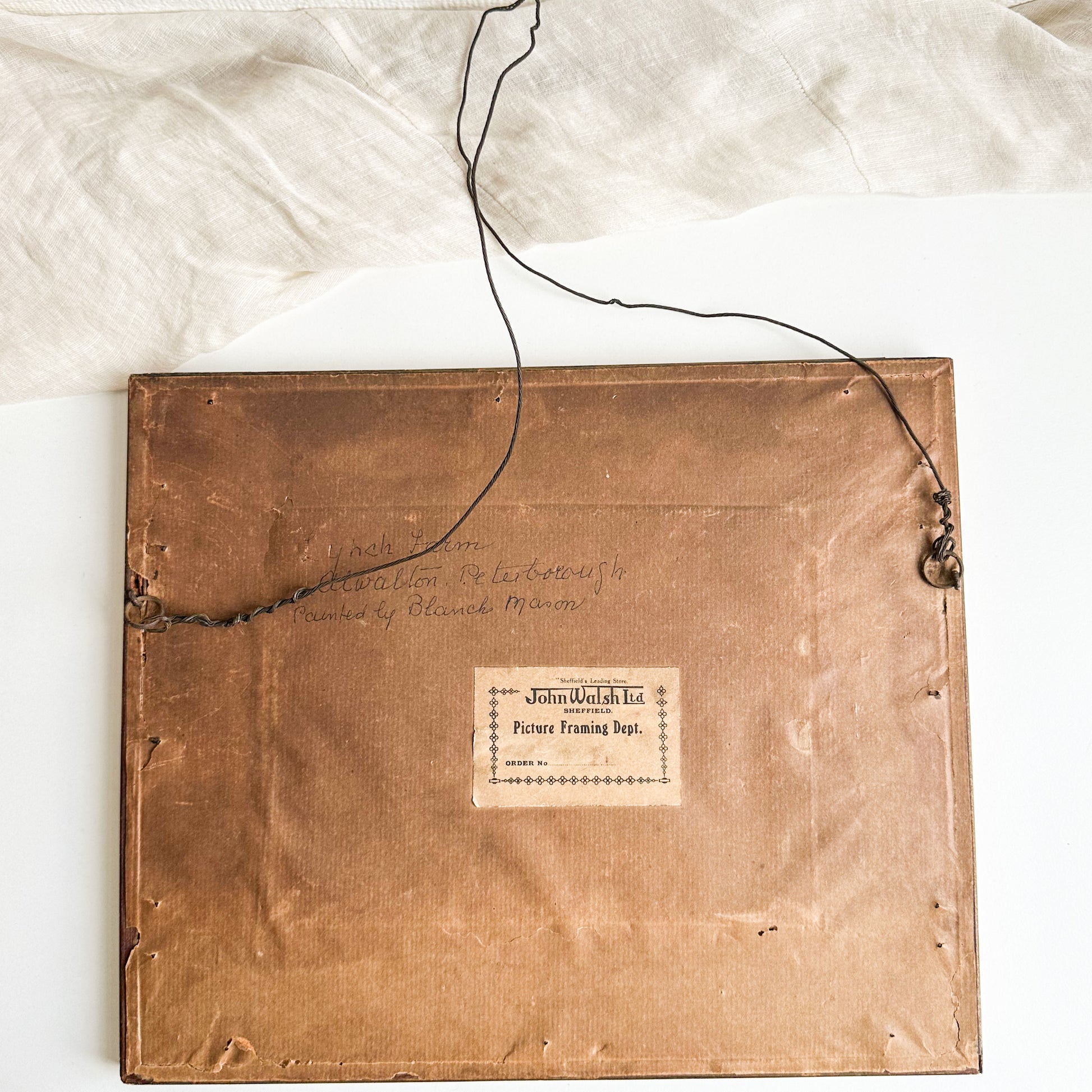 Ornate gilt frame, gold matting and protective glass. Likely from the 19th century. Painted by Blanch Mason.