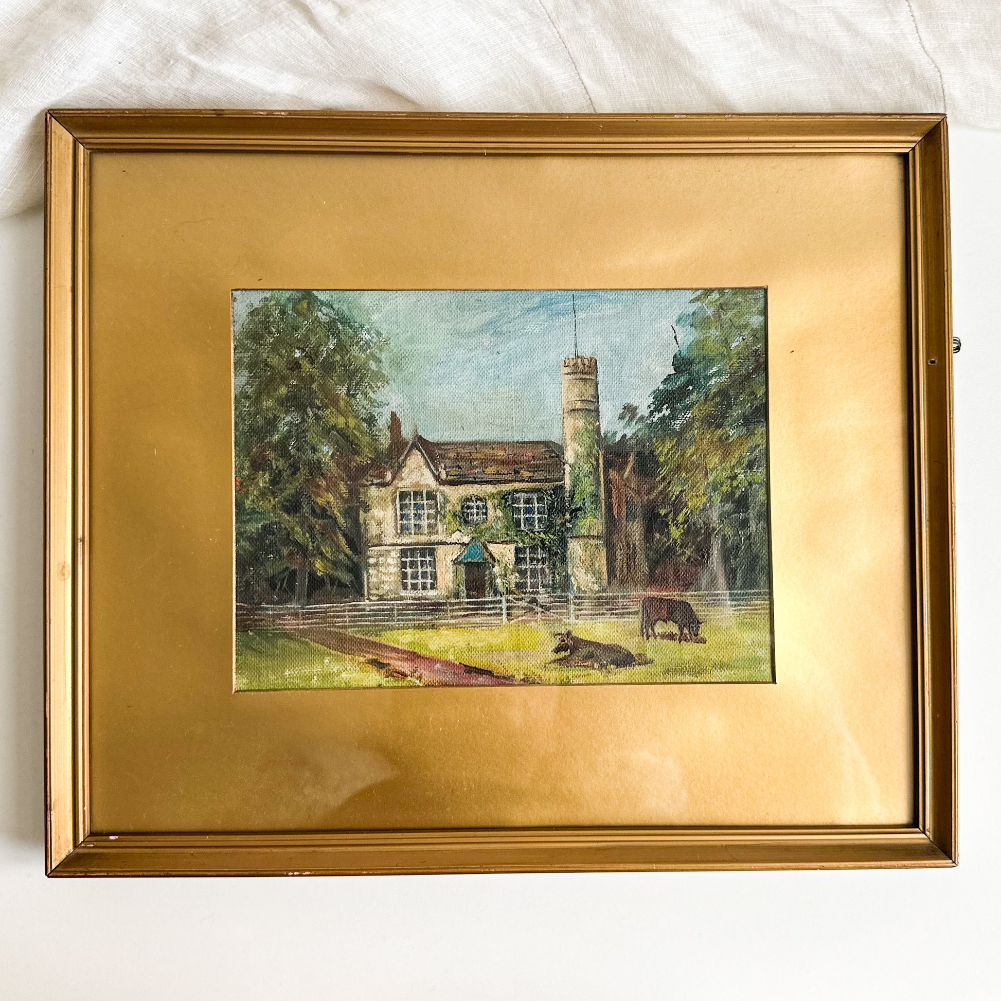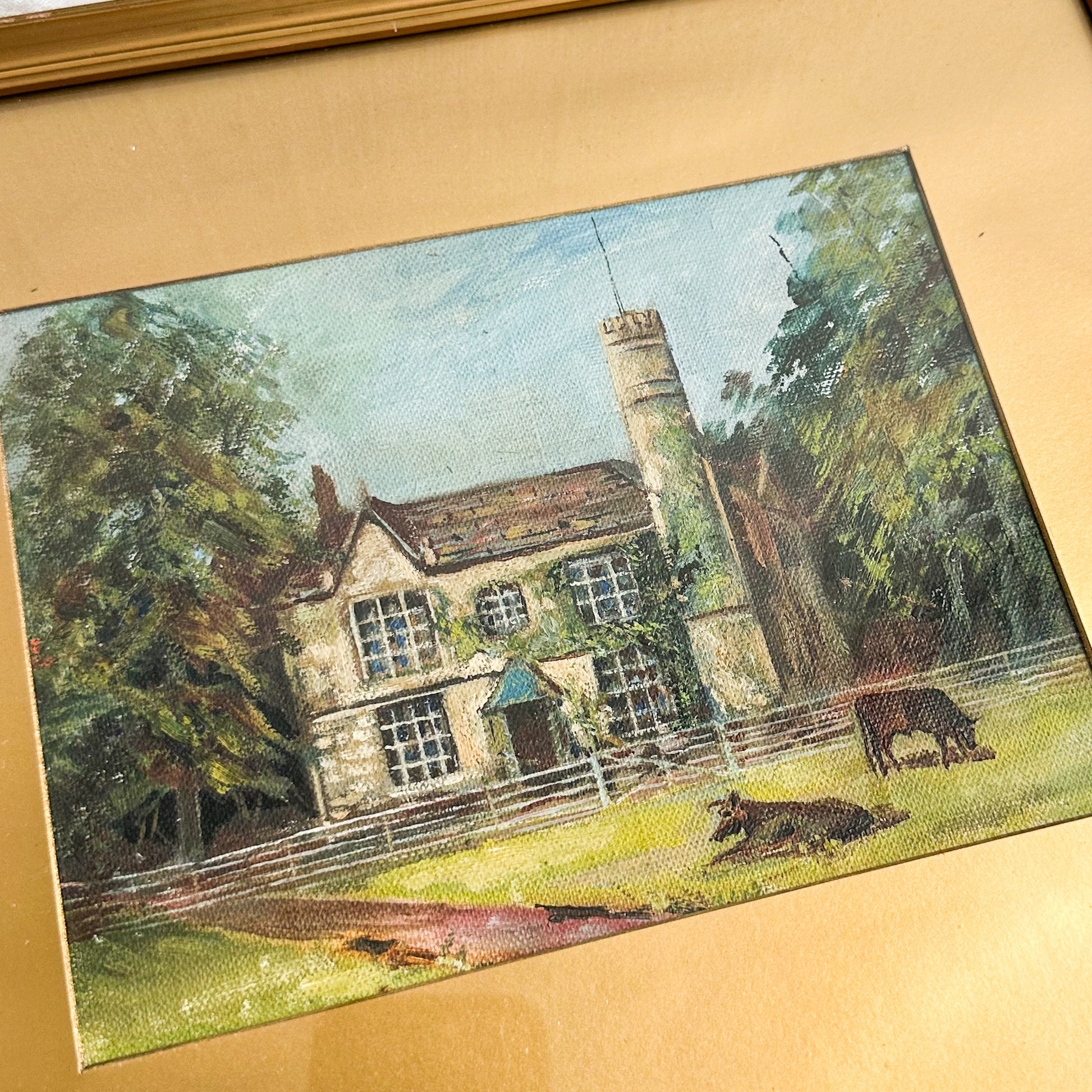 A stunning original oil painting depicting Lynch Farmhouse, located in Peterborough, England. The building is surrounded by lush trees and two brown cows in front of it.