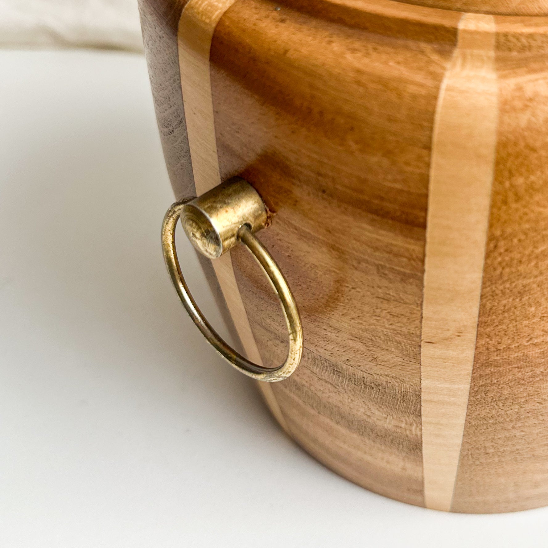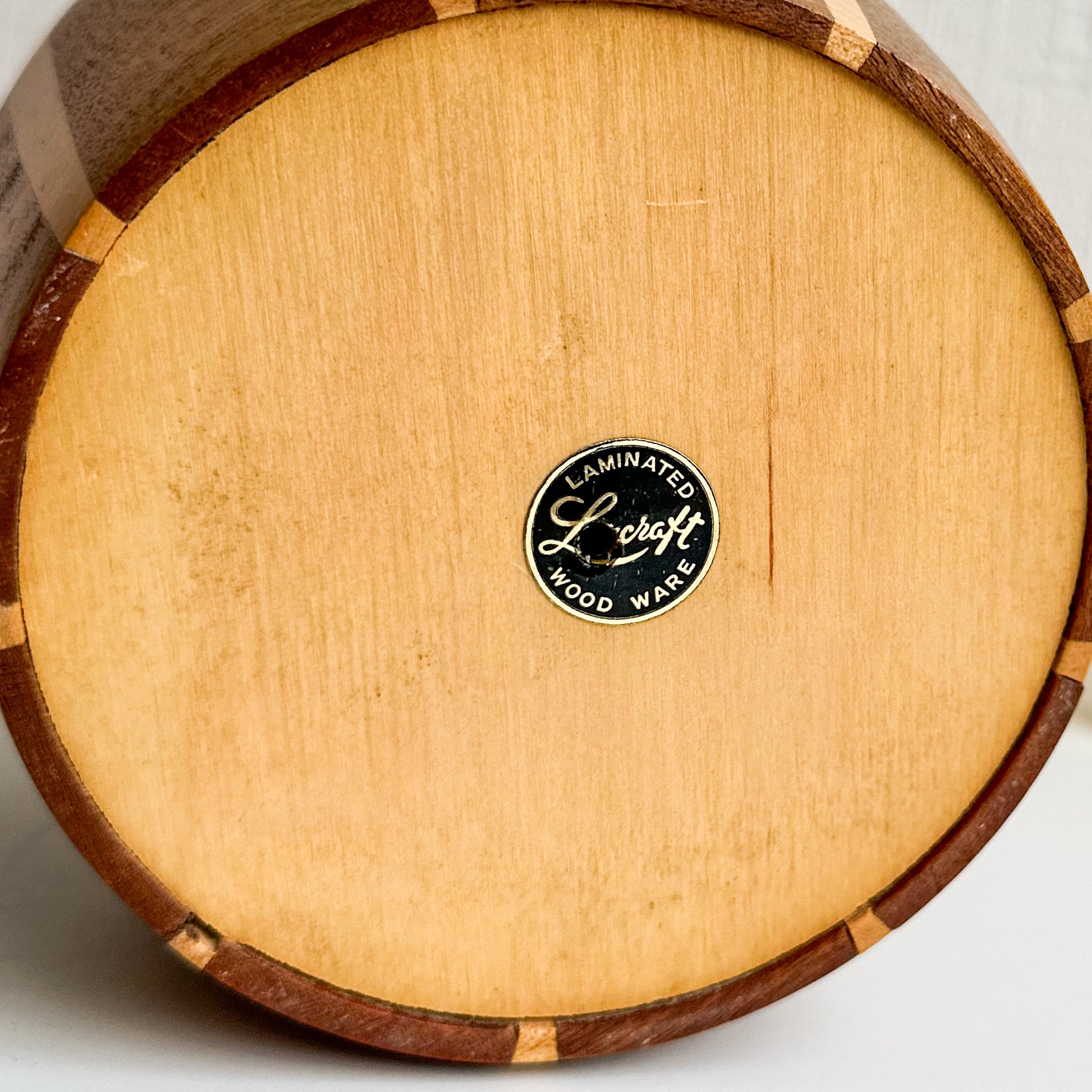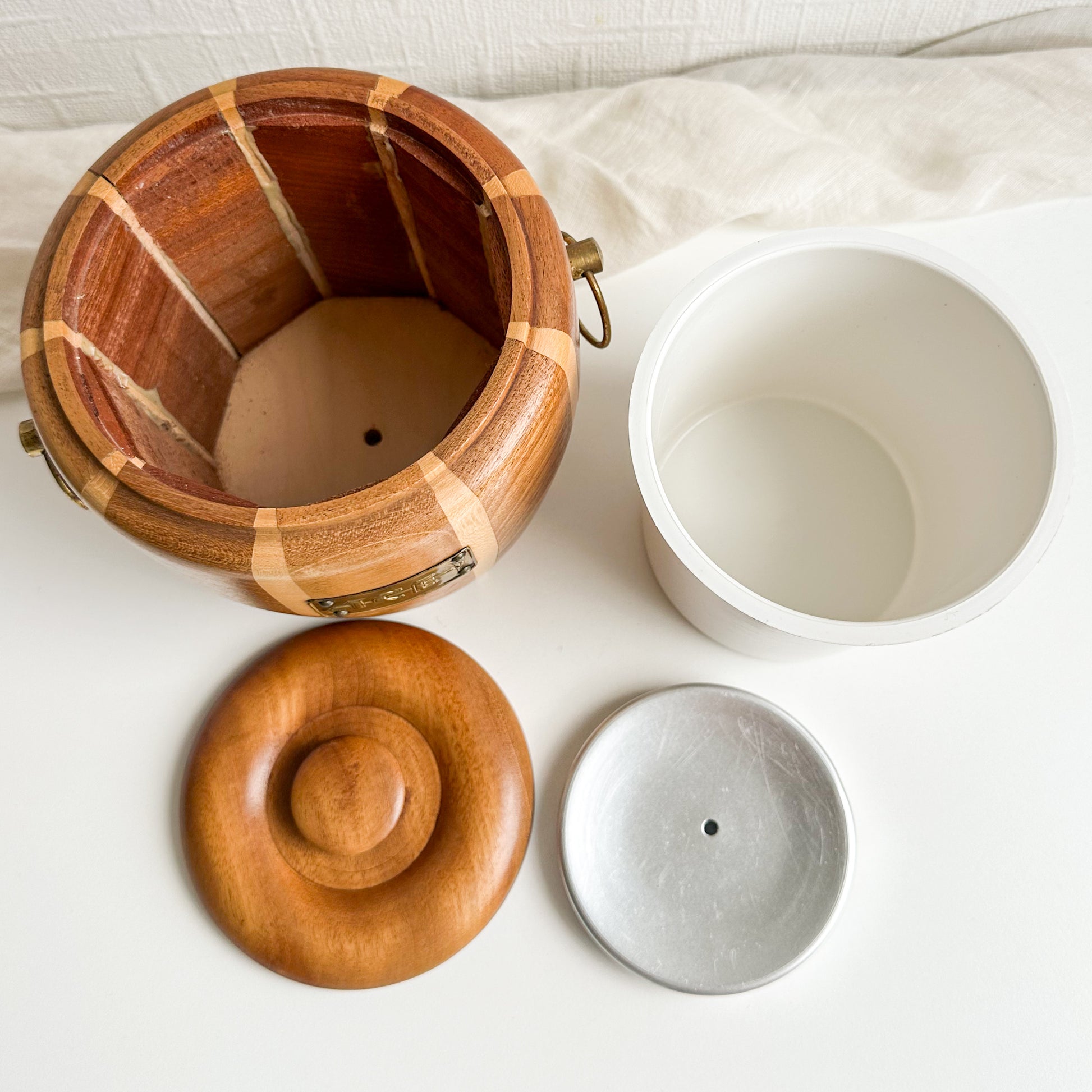 A beautiful vintage Lancraft laminated wood ice bucket. It has a removable white melamine inner liner and an aluminium piece for drainage at the bottom. It features a brass plaque on the front with "ICE" engraved and an ice-axe detail.