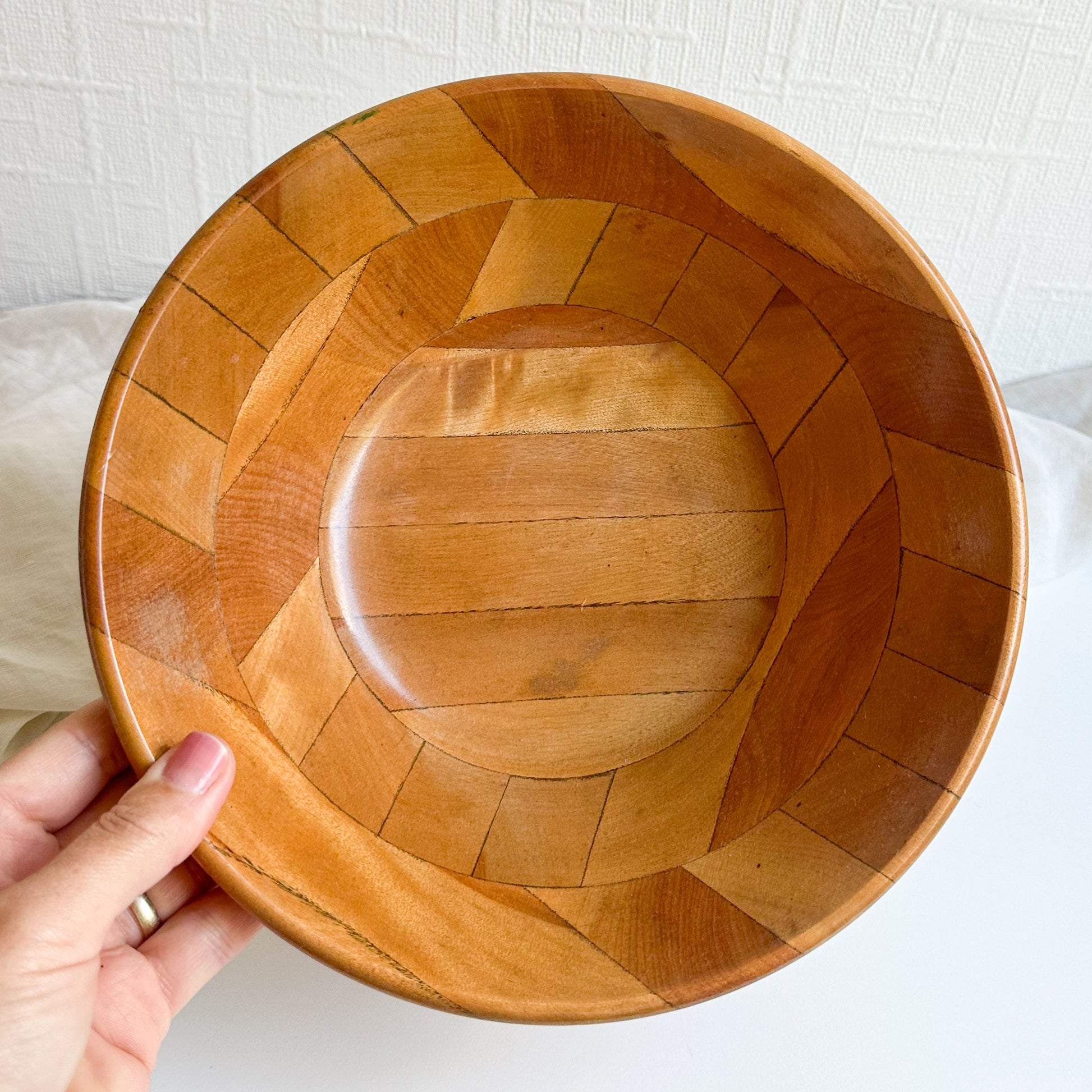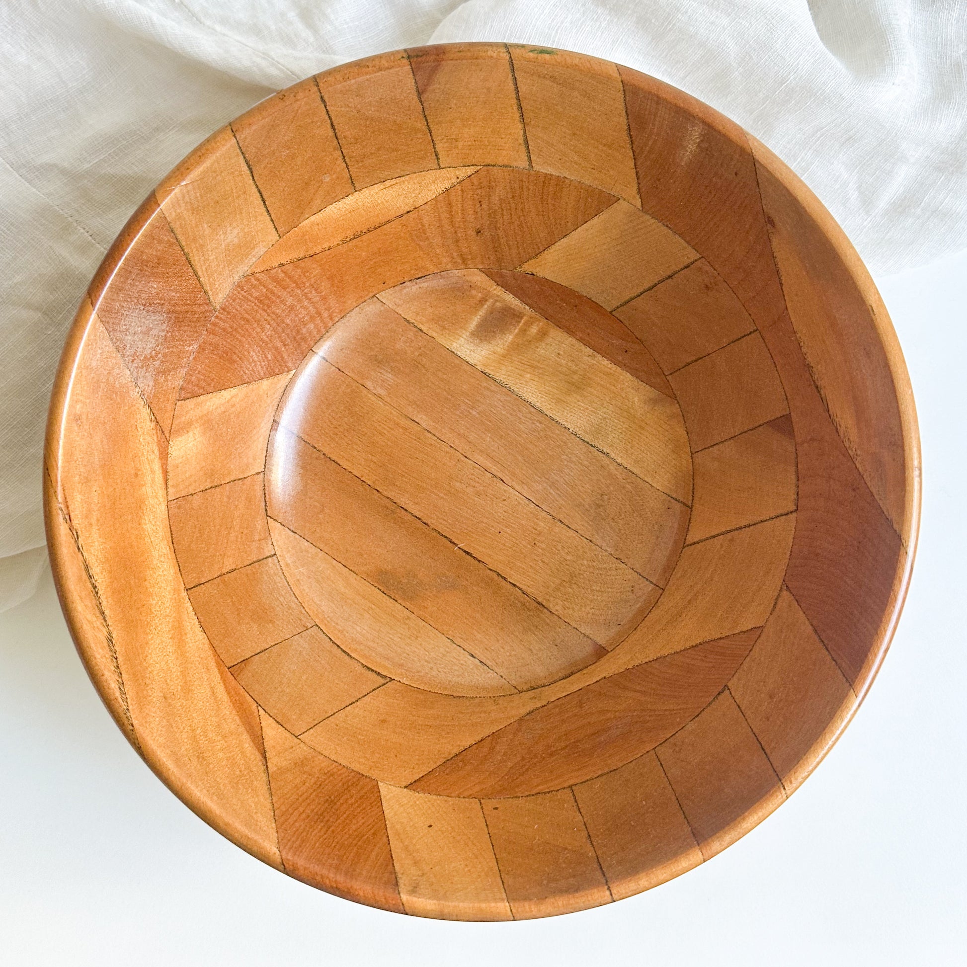 A hand turned wooden bowl, perfect for fruit or just as a catch all. The perfect mid-century piece for your decor. Likely made in Japan by Woodcrest. Looks teak.