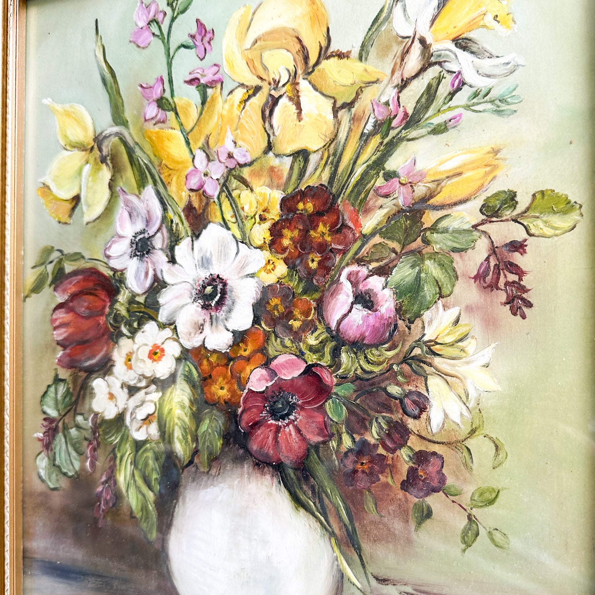 An original oil painting, featuring spring flowers in a white vase. Completed with a beautiful frame and protective glass. Signed B A Roberts.