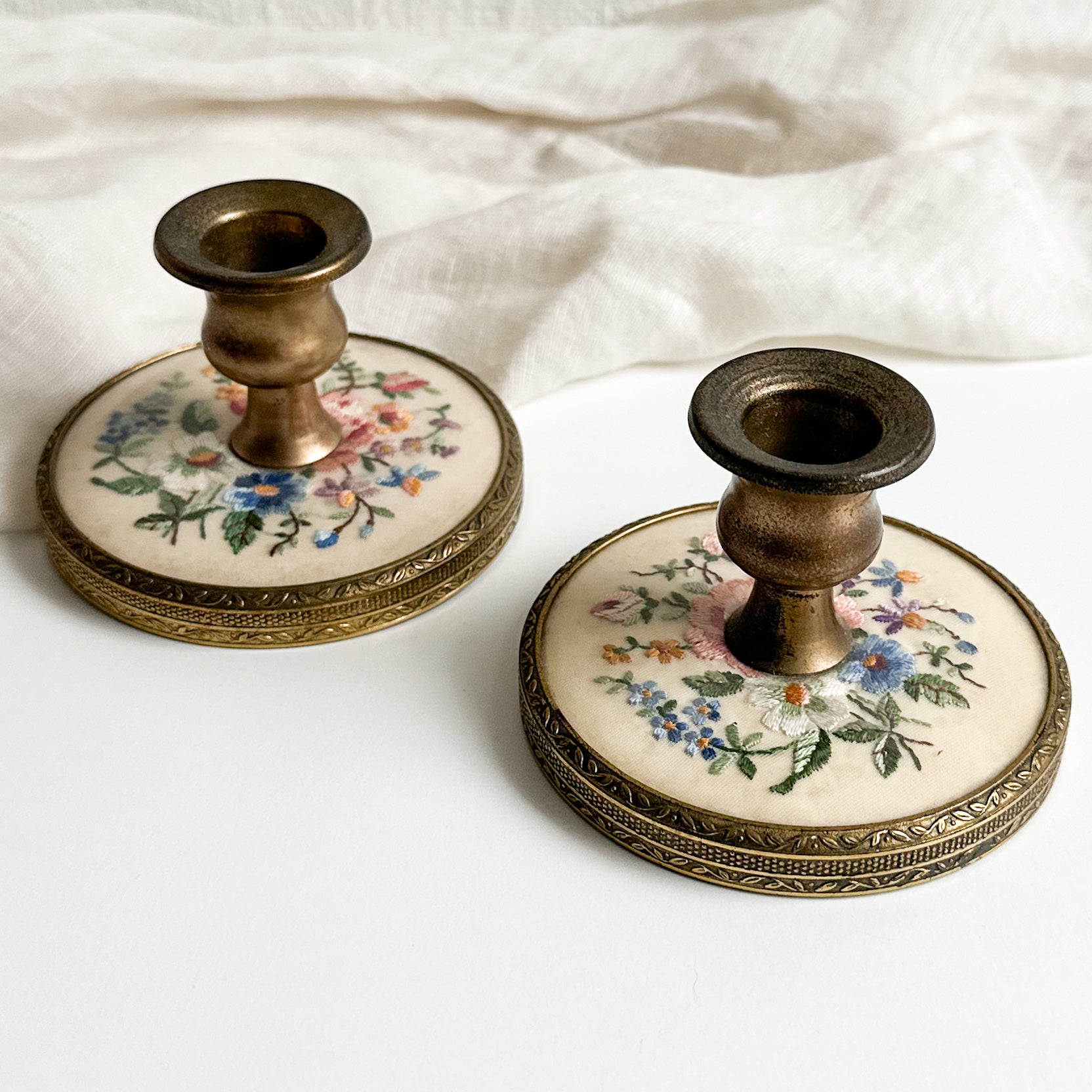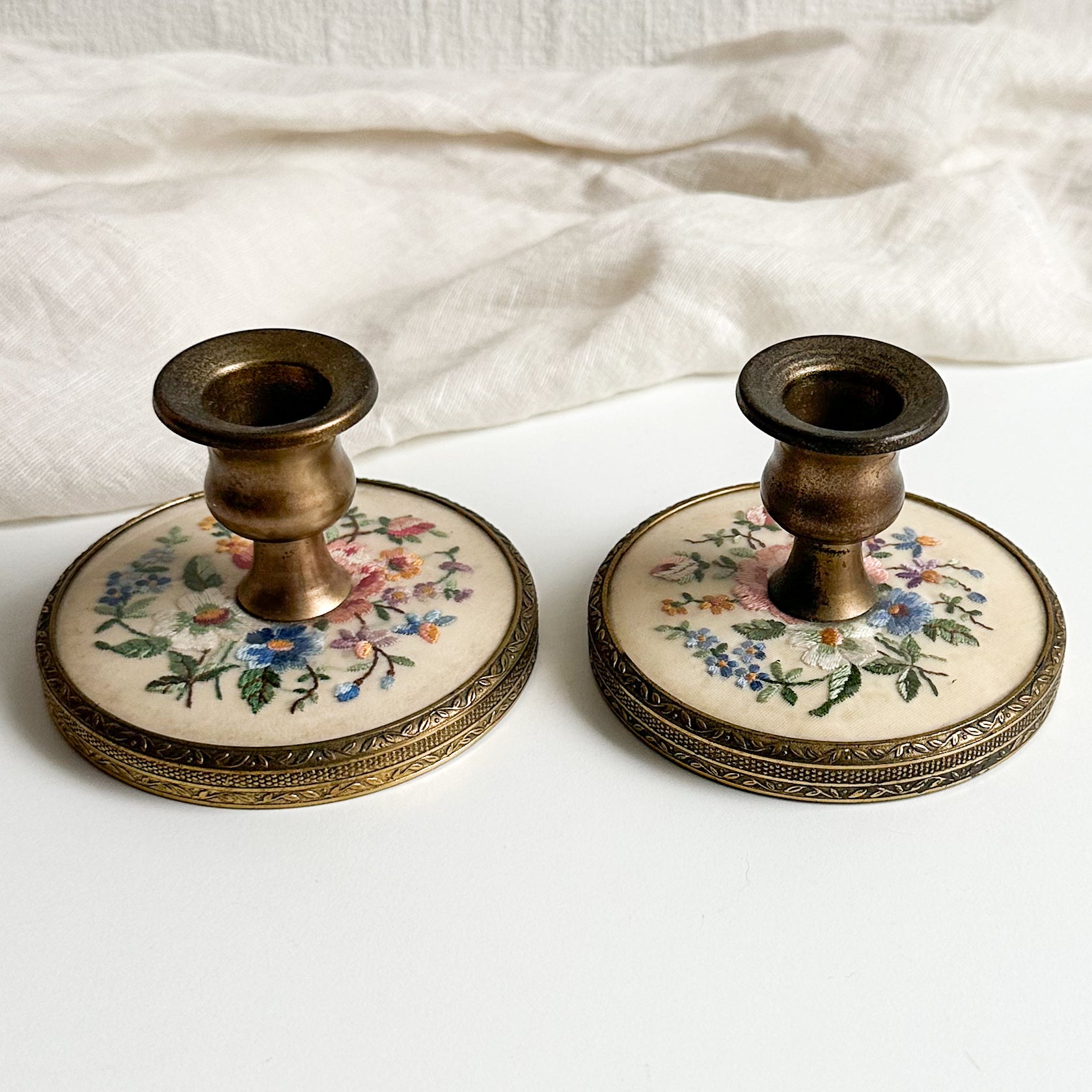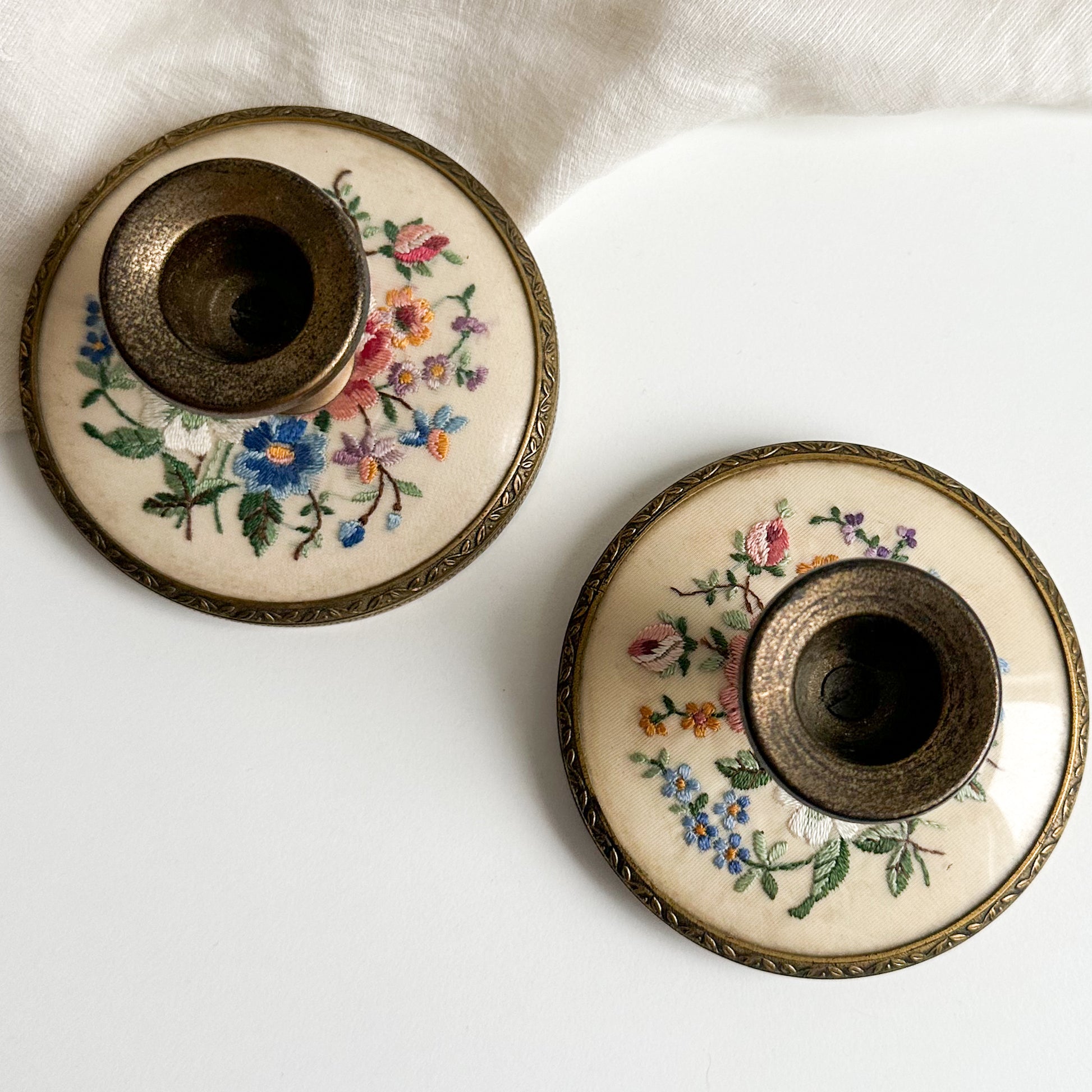 A beautiful pair of brass candlesticks with floral hand embroidery at the base. Beautiful design to the metal at the base.