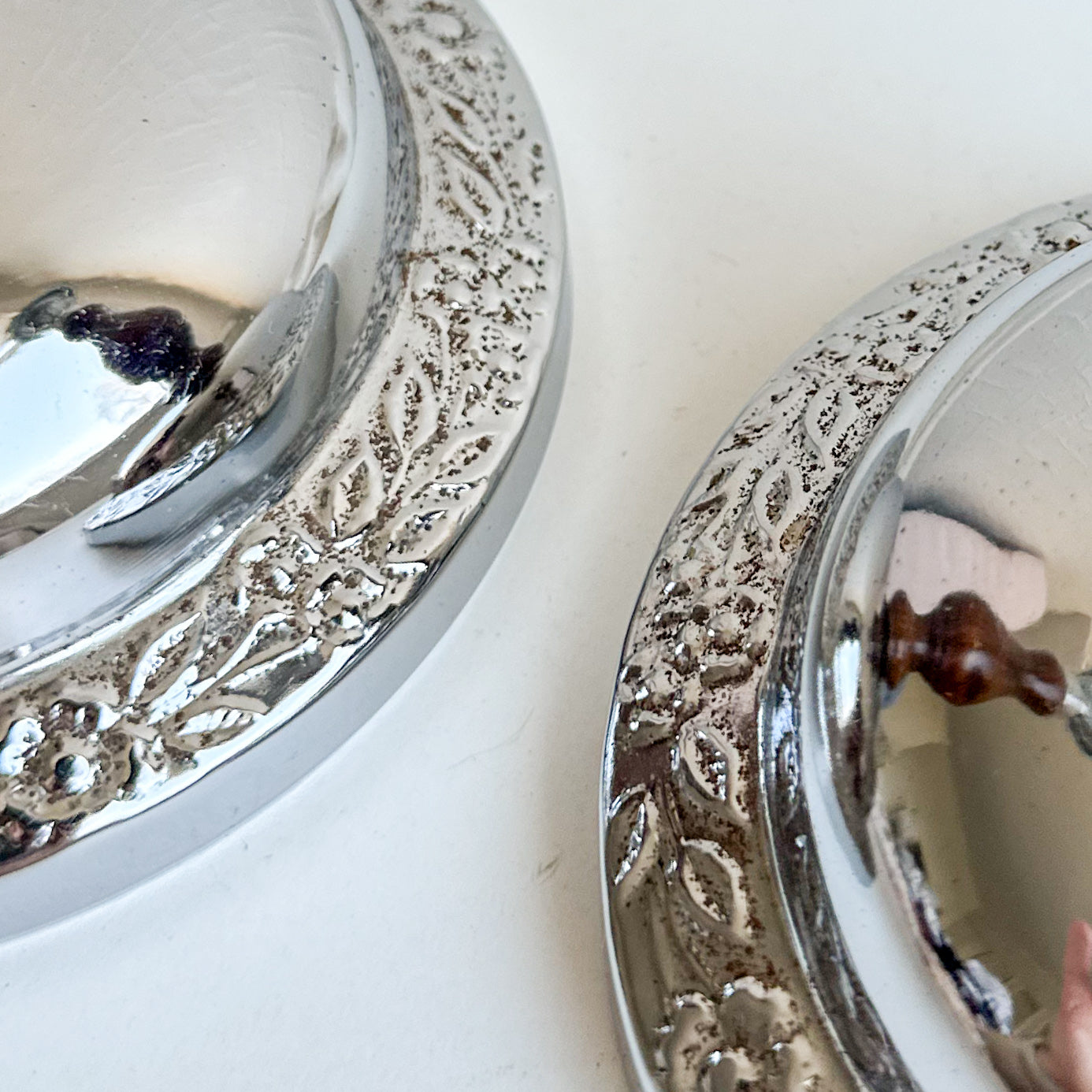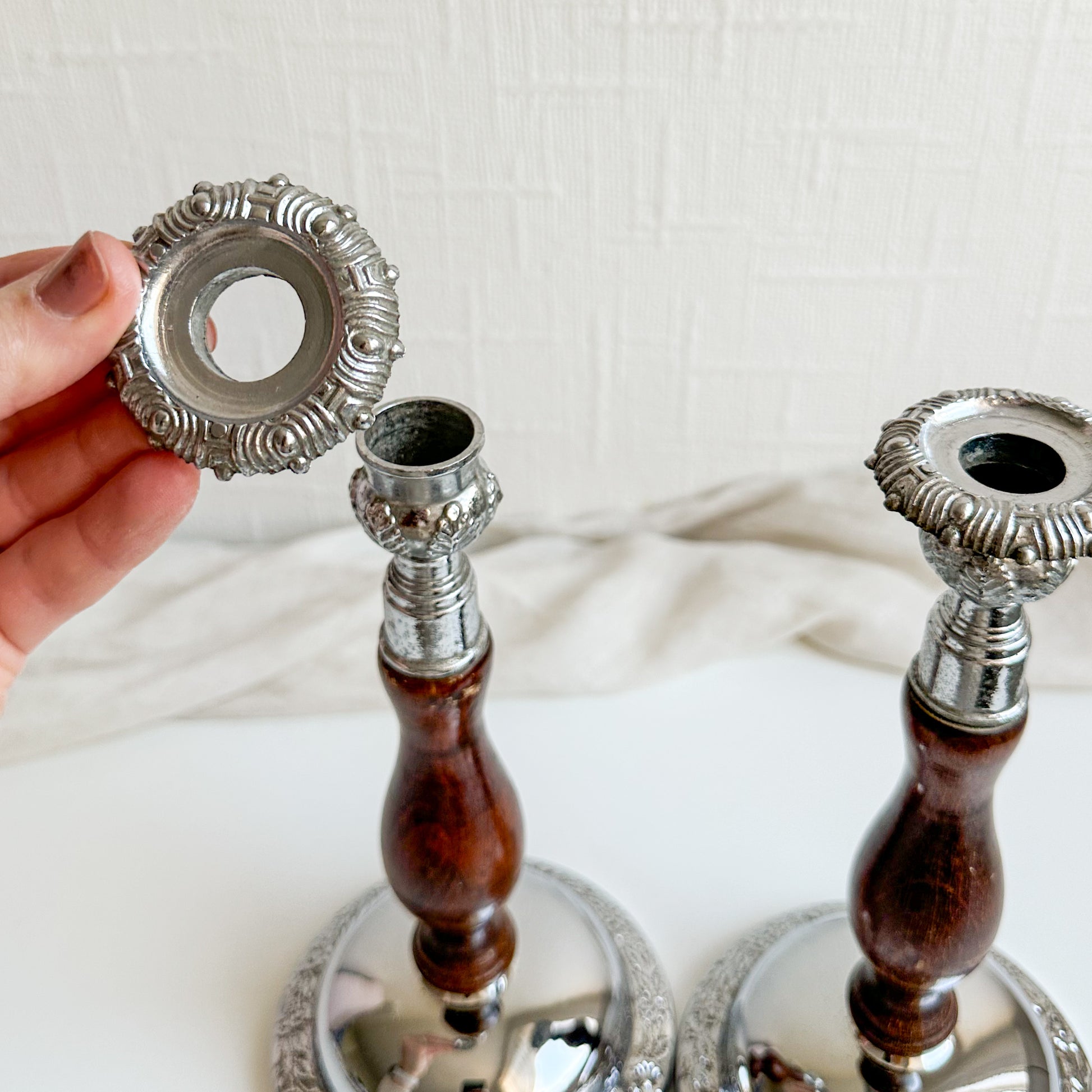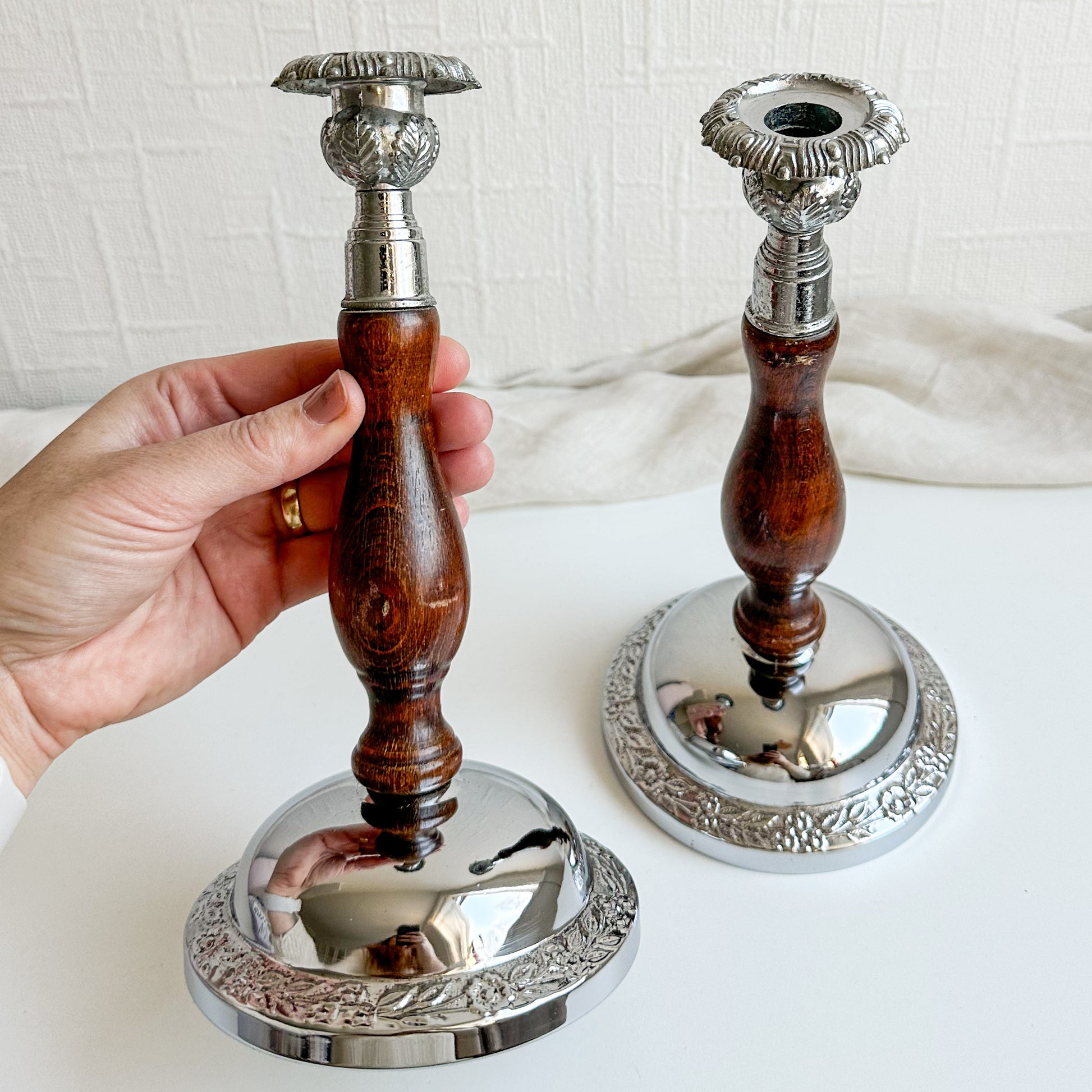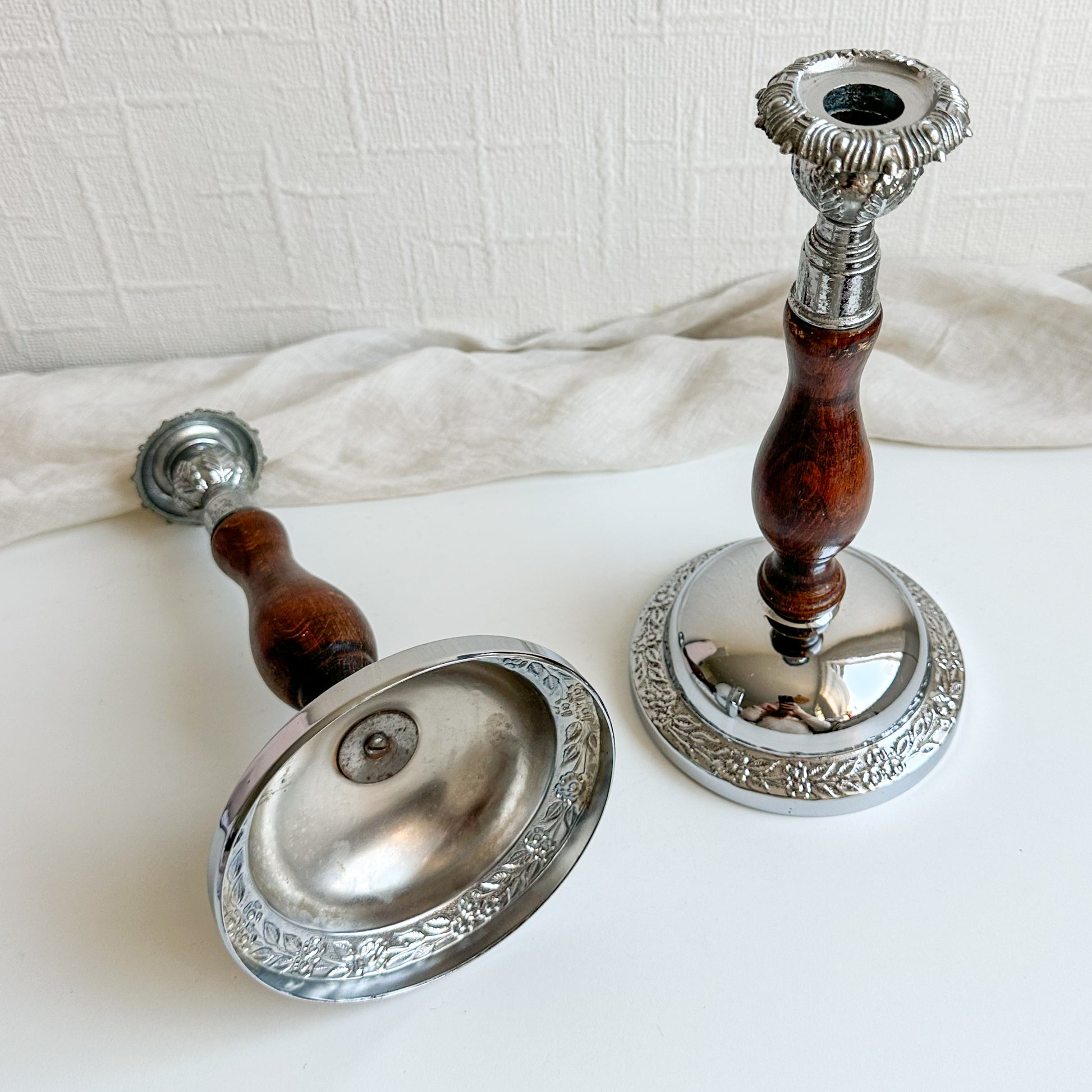 A pair of beautiful candle holders with oak stem. Silver plated top and base with a lovely ornate design. The tops pieces are removable for cleaning the wax easily.