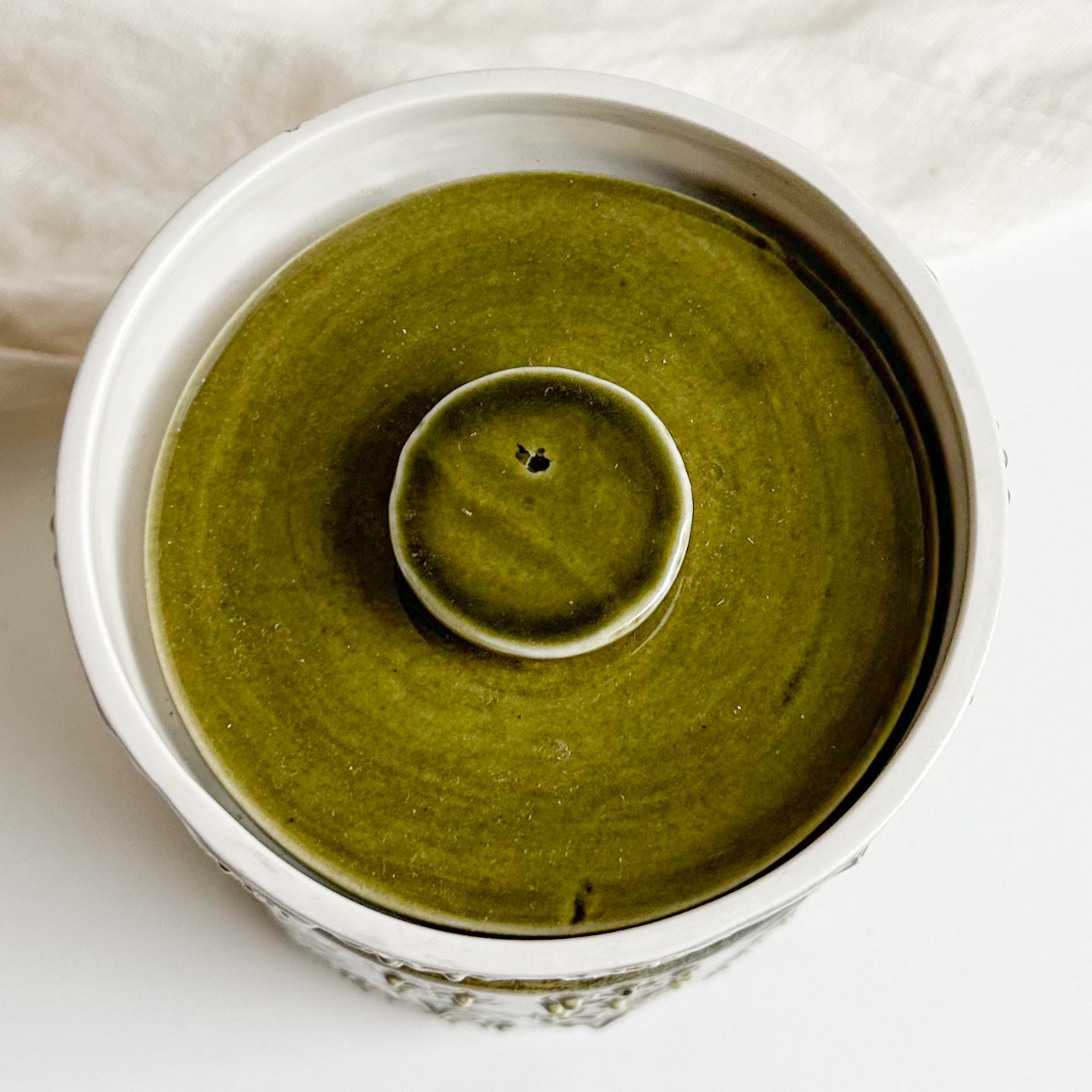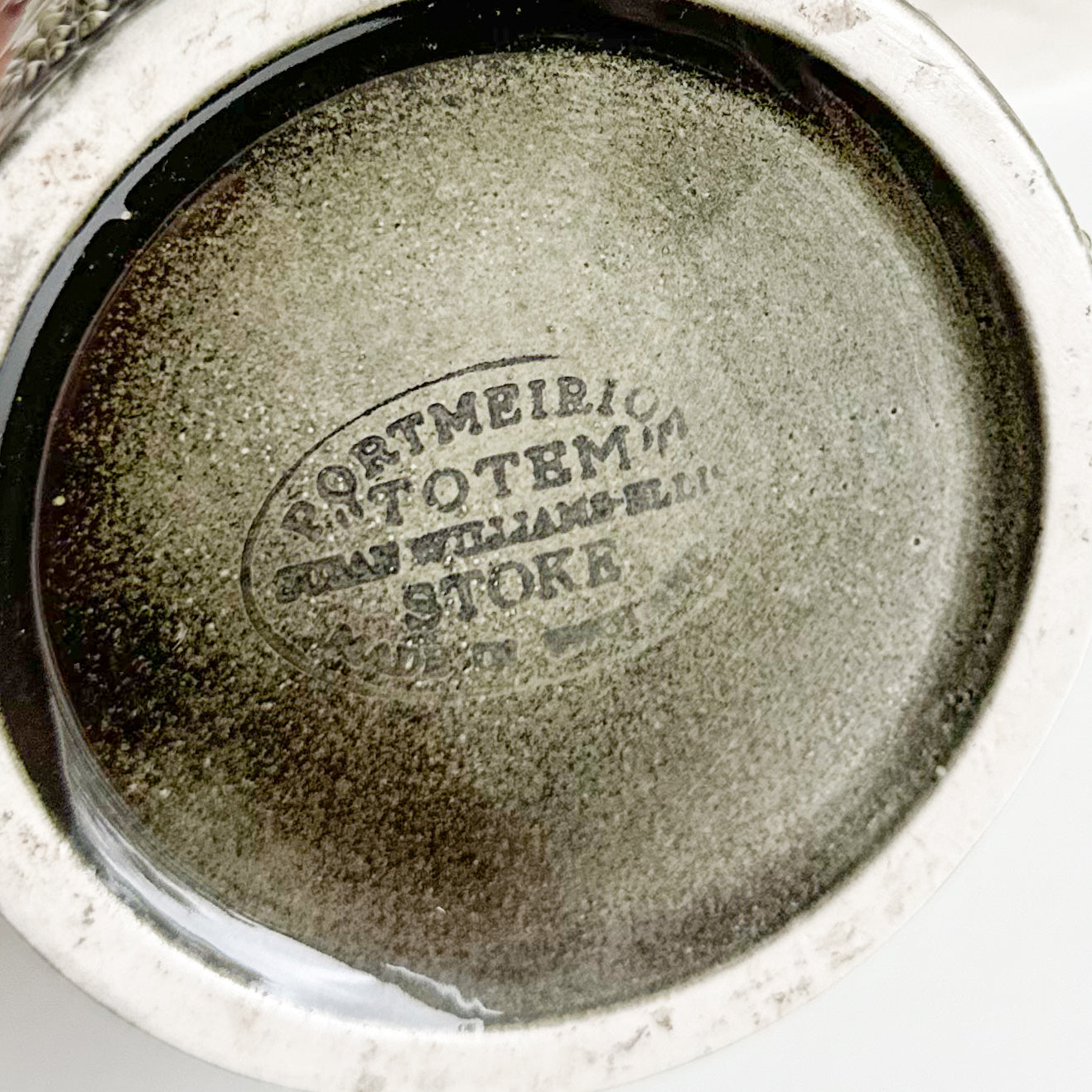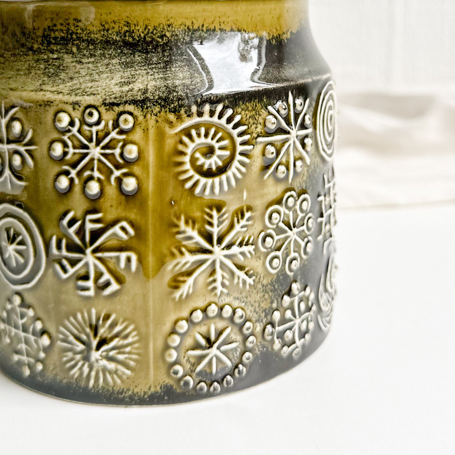 A gorgeous lidded canister made by Portmeirion, featuring the Totem design. Raised patterns and a beautiful green background.