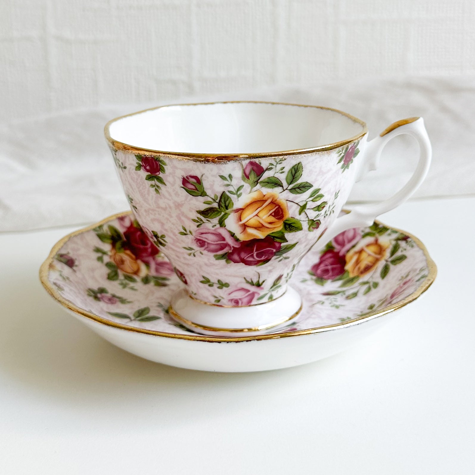 Vintage cup and saucer set made by Royal Albert. A lovely variation of the Old Country Roses pattern with pink background, called “Soft Pink Lace”.