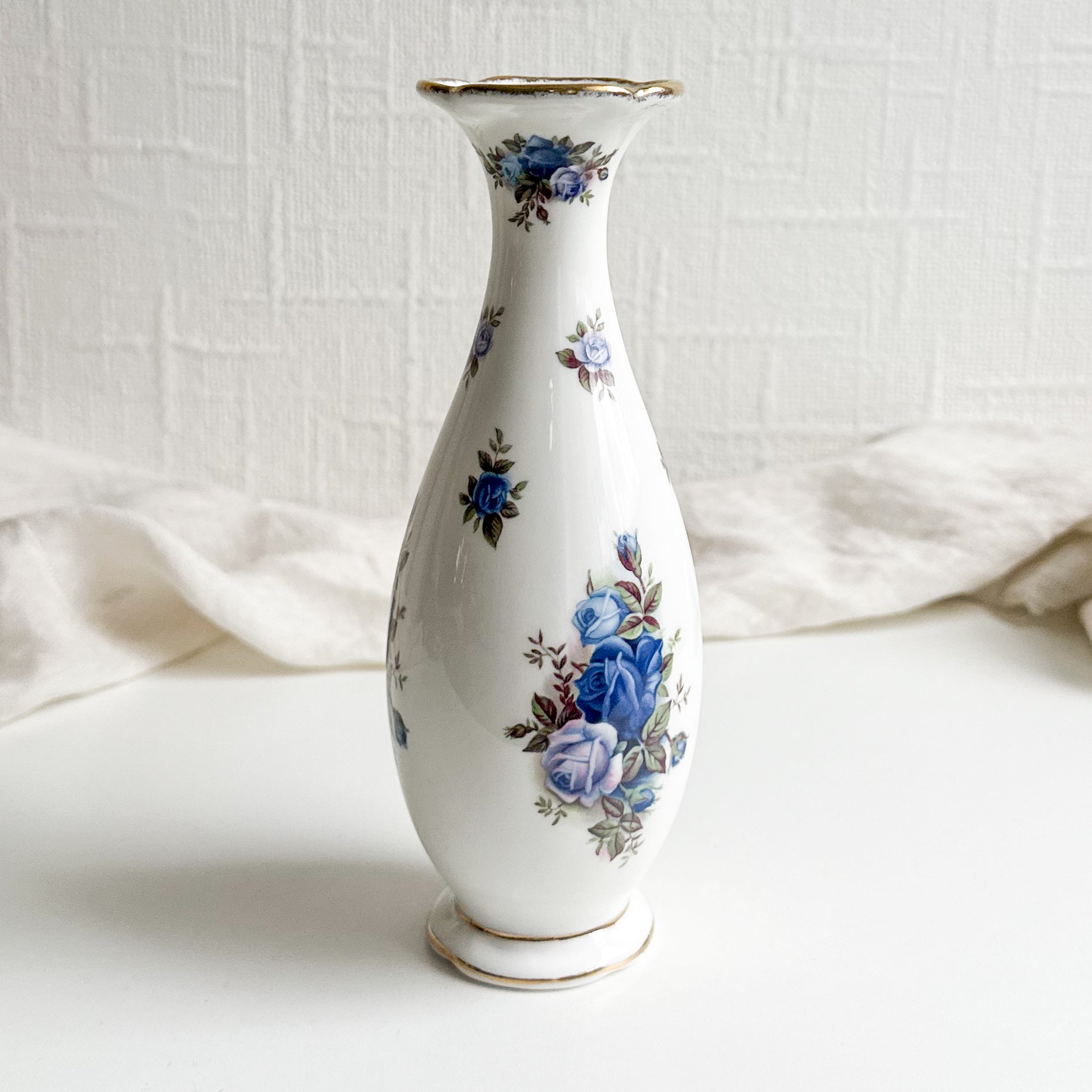 Beautiful Royal Albert vase featuring a delicate blue rose pattern. The pattern is called “Moonlight Rose” and is quite sought after.