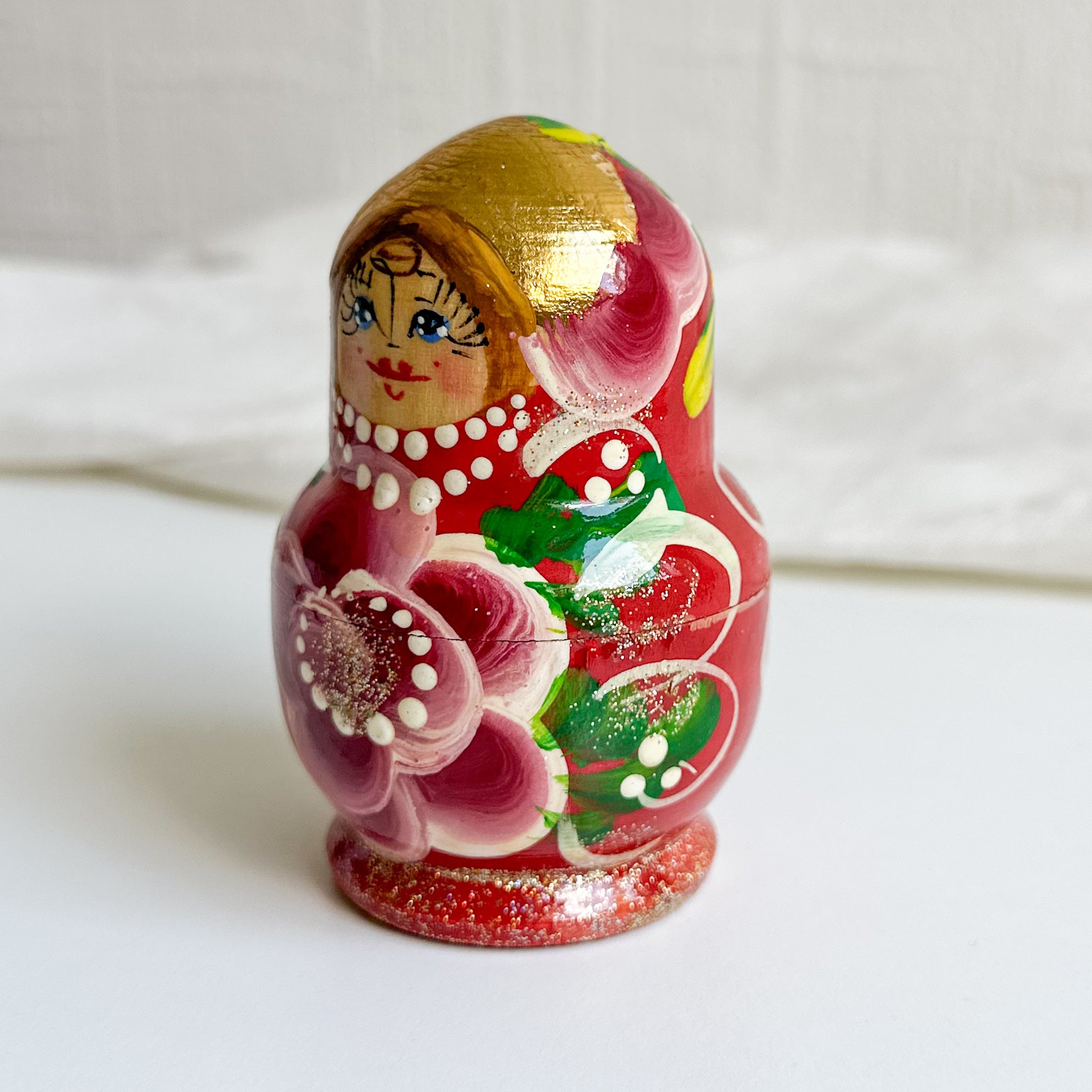 Lovely hand painted Russian Matrioshka nesting dolls. 4 adorable smaller dolls nest inside the largest one. The smallest doll is very tiny!