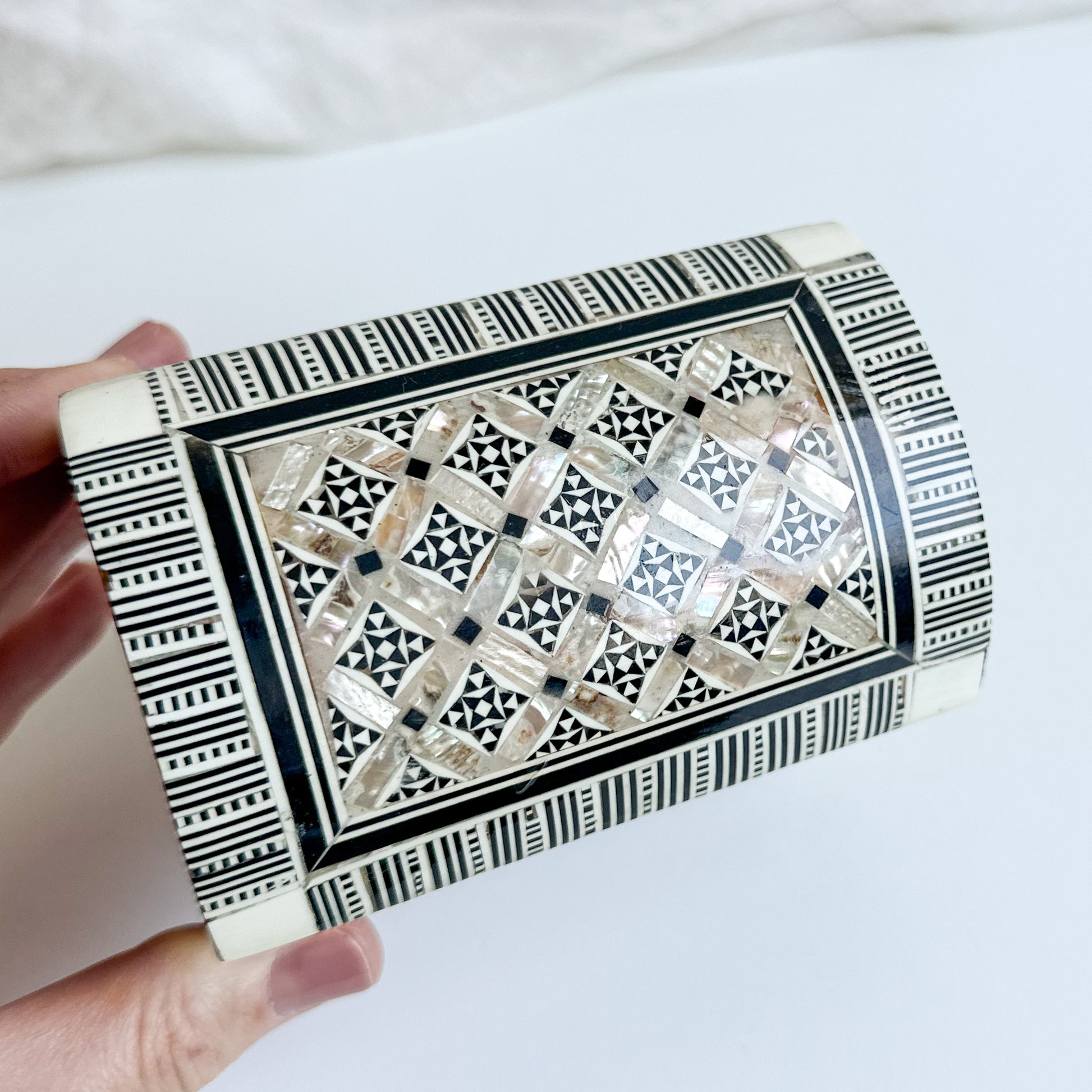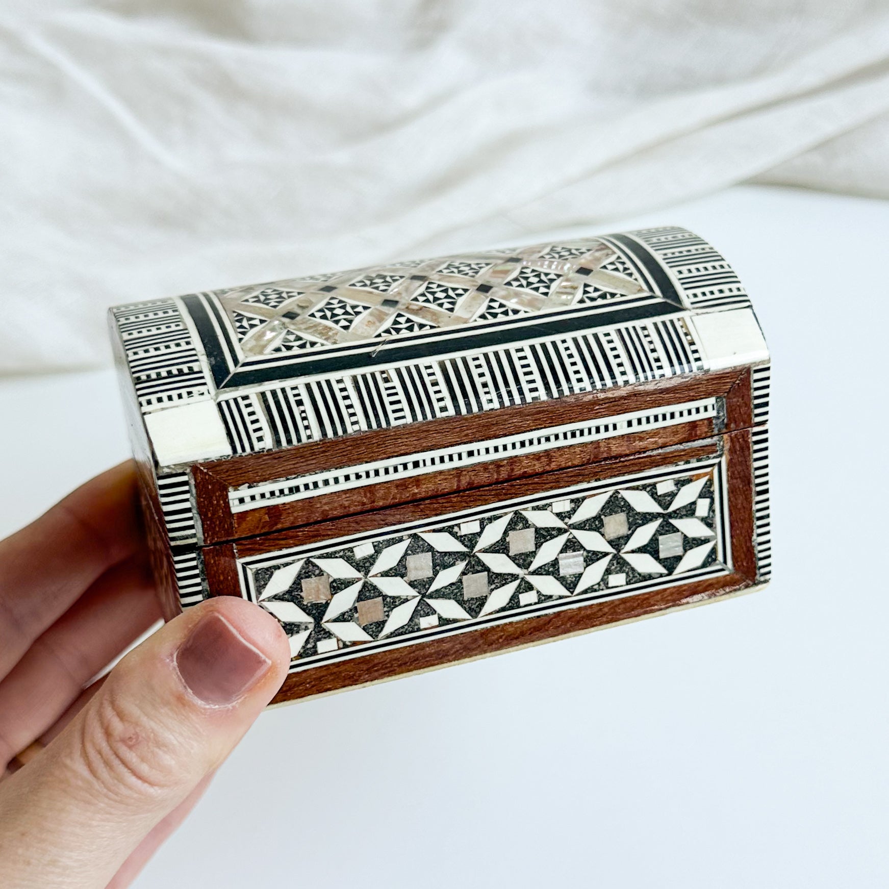 Beautiful wooden box, with geometrical inlaid pattern. The interior is lined with red material. Suitable as a jewellery box or for other small treasures.