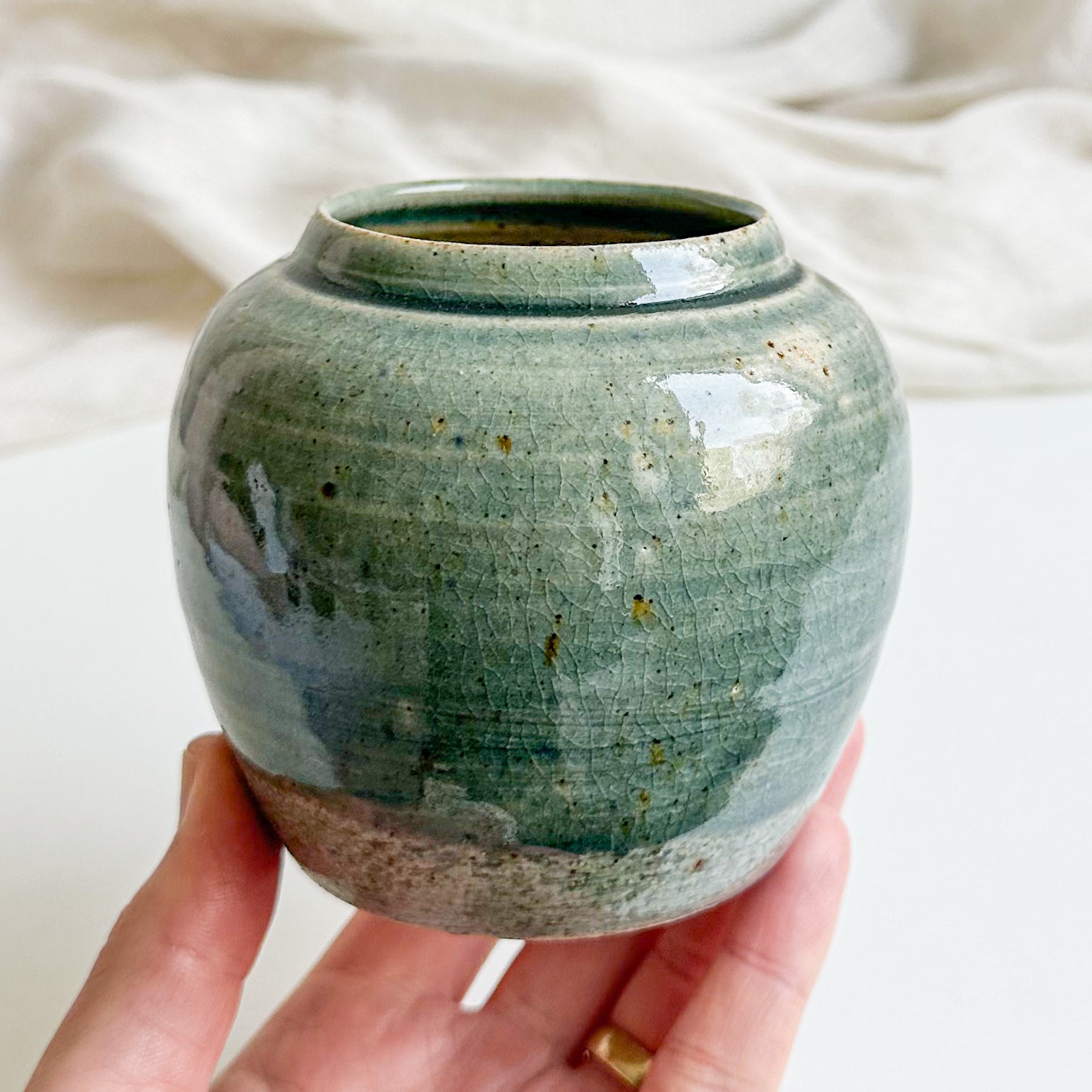 A beautiful studio pottery vase, featuring a lovely teal glaze with brownish speckles and crazing effect. Signed by the artist on the bottom.