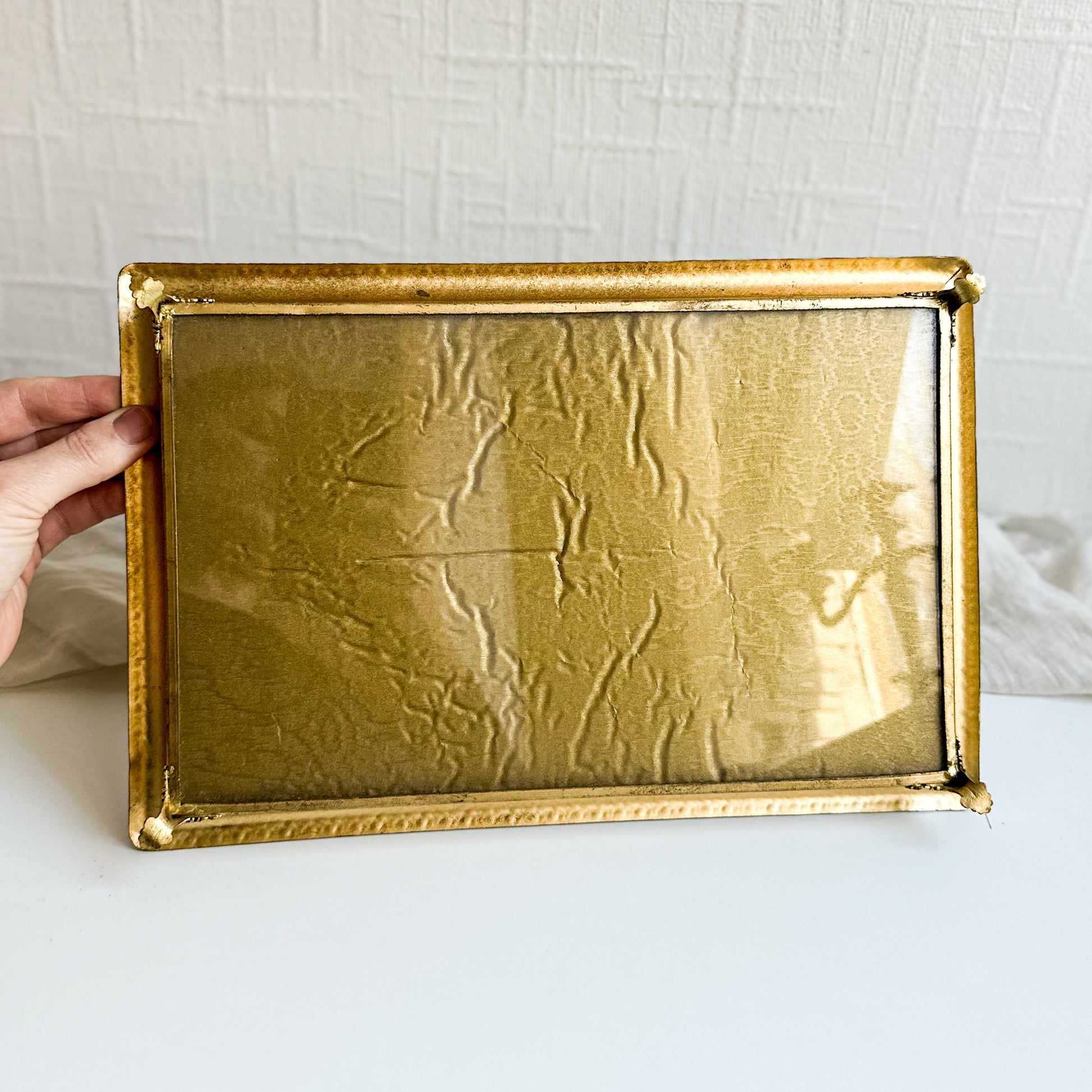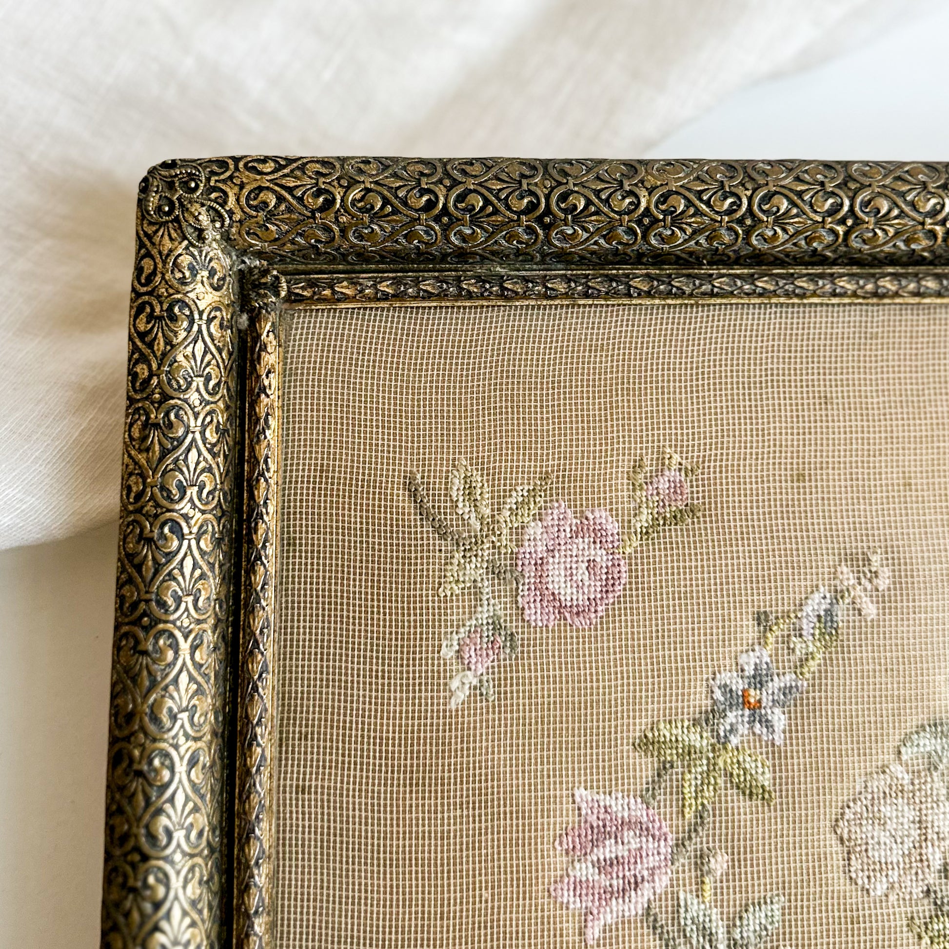 A beautiful vanity tray made of brass, glass and hand embroidered floral tapestry. Ornate border and legs.