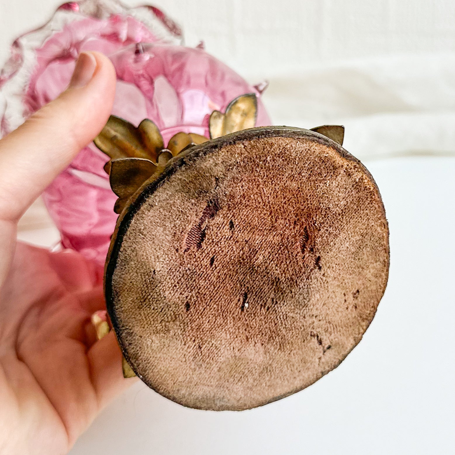 Condition: good condition, no chips or cracks. Just a little cloudiness to the glass on the inside. The metal base is not perfect and the bottom looks pretty rough, expected for its age.