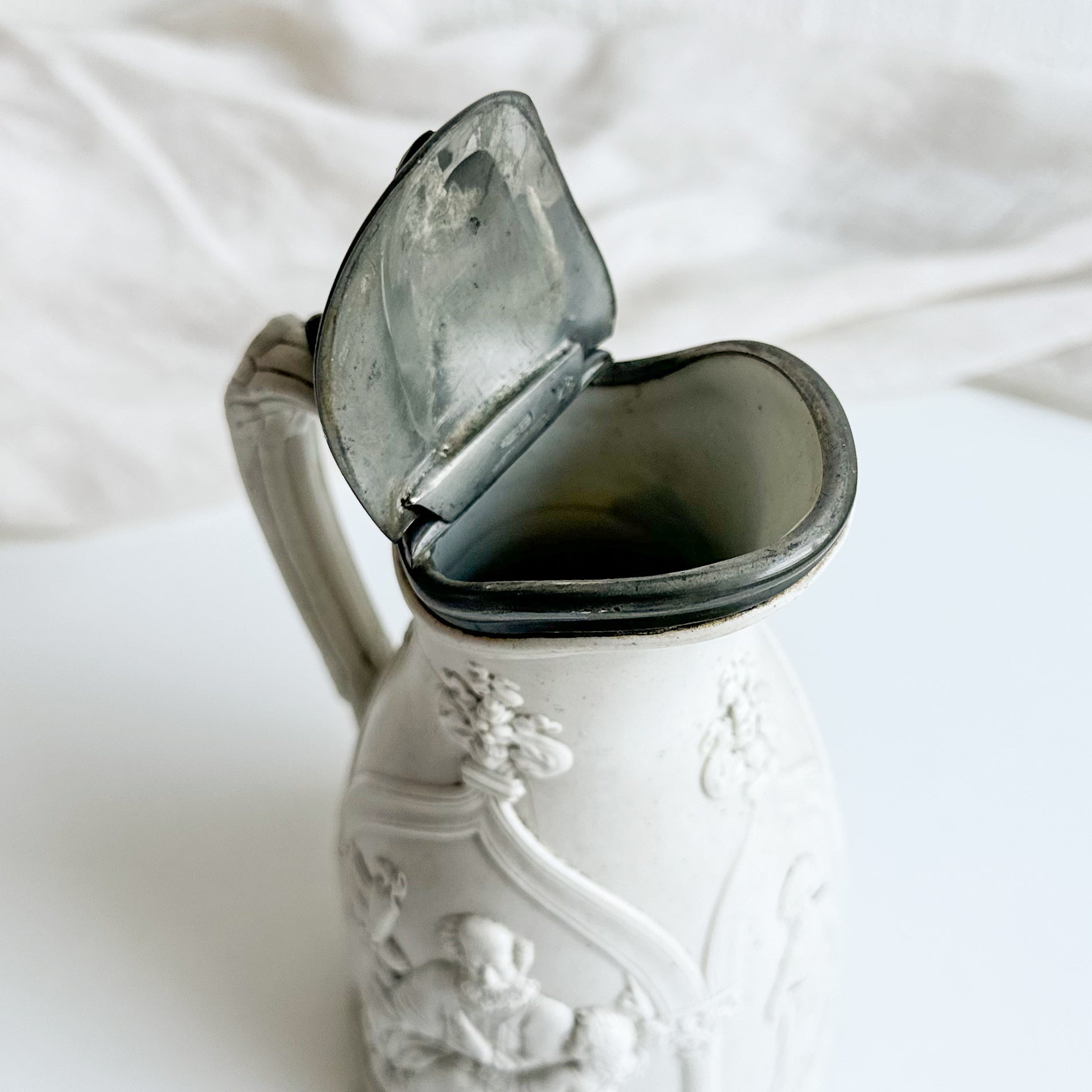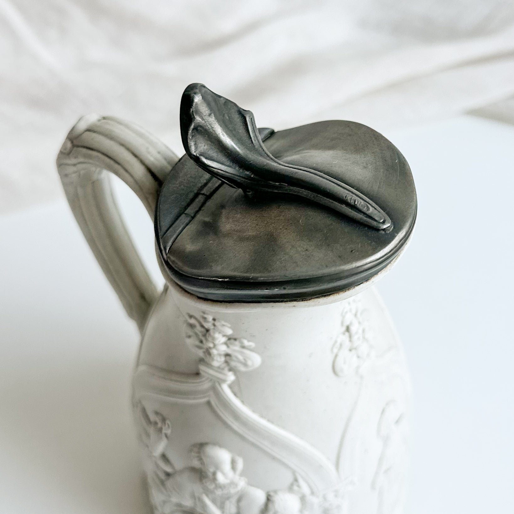 Antique jug with hinged pewter lid and intricate design in relief. Lovely detail on the lid. Made by T & R Boote, c.1848.