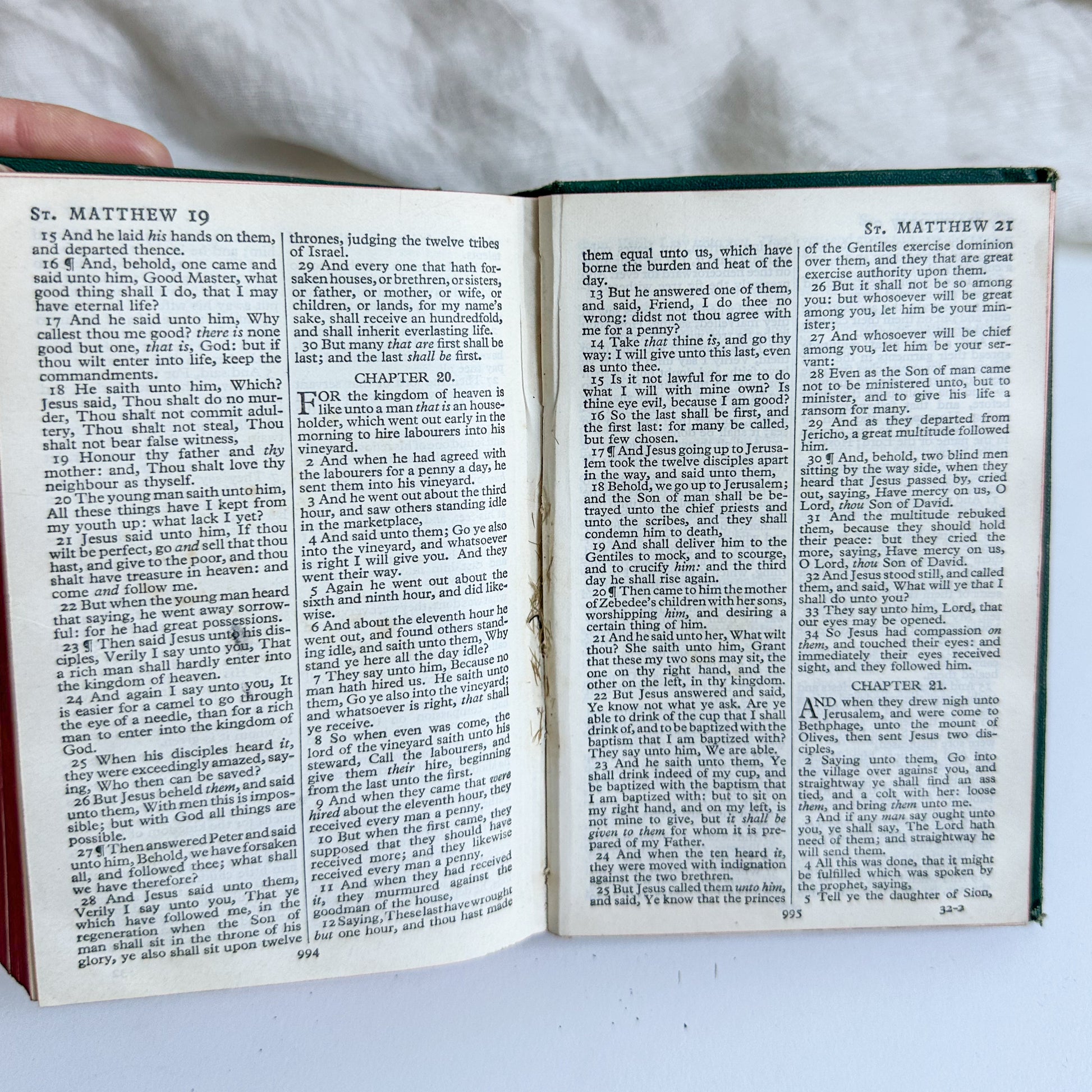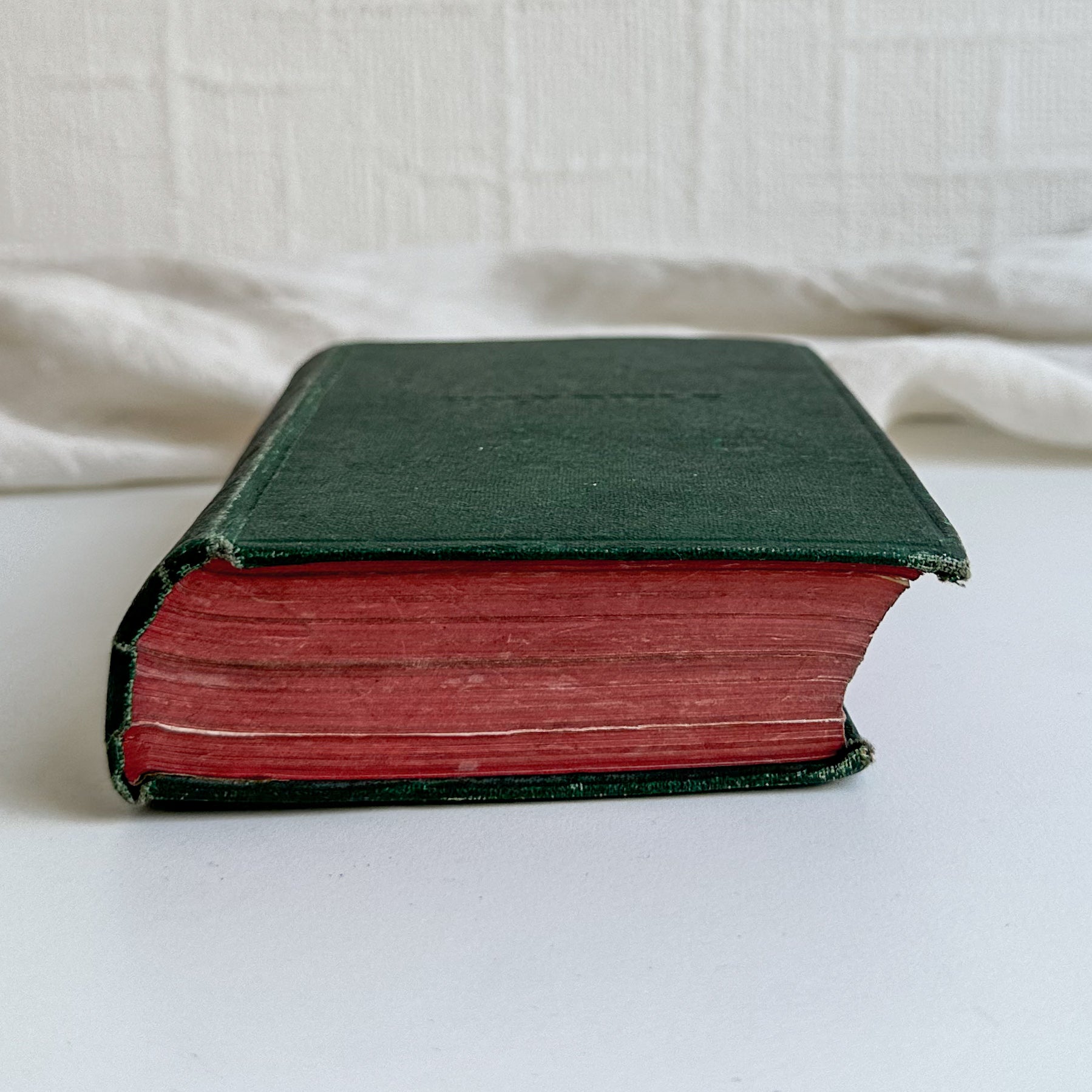 An old bible with green hard cover and red edges.
