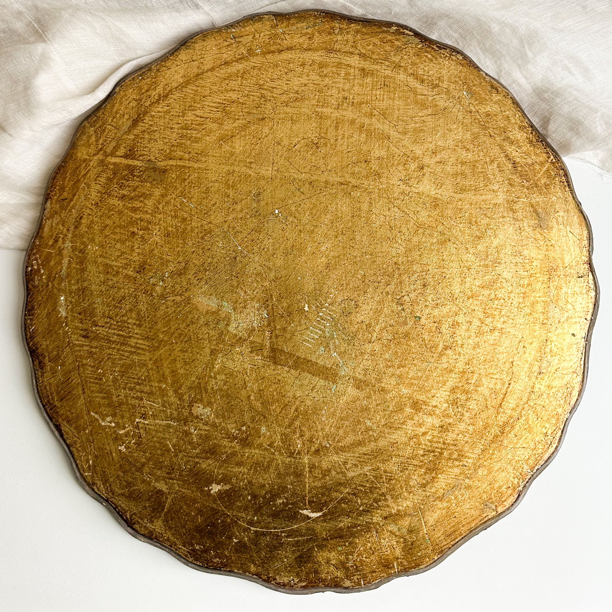 A beautiful decorative Florentine tray in gold and black with a hand painted floral design in the centre.
